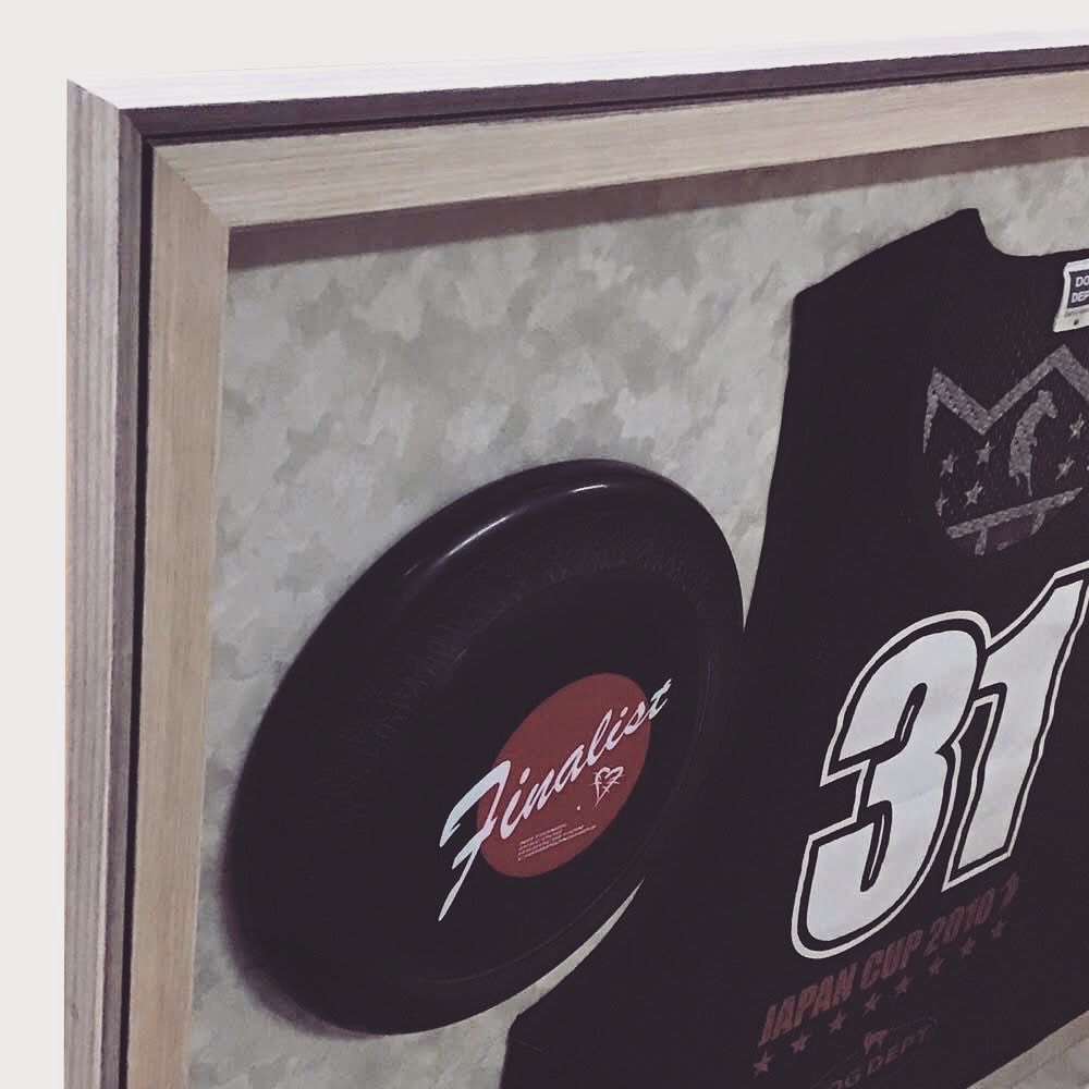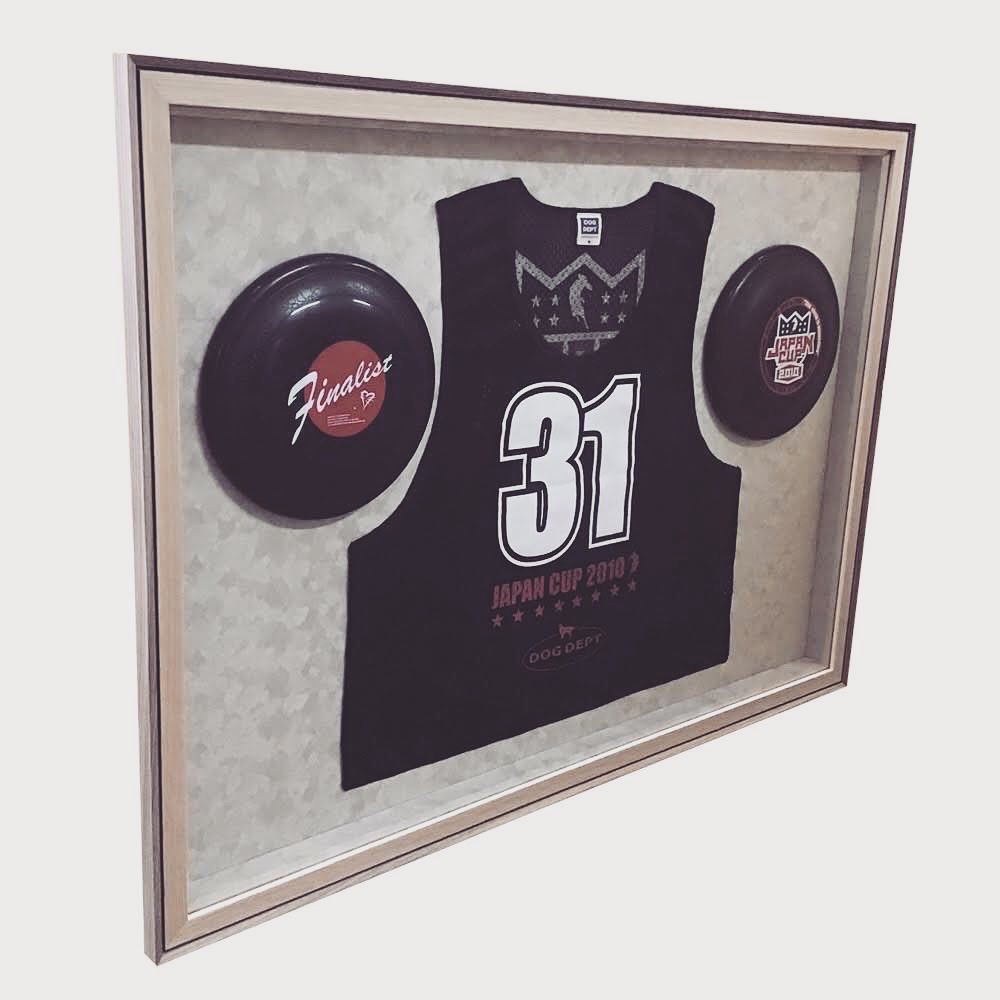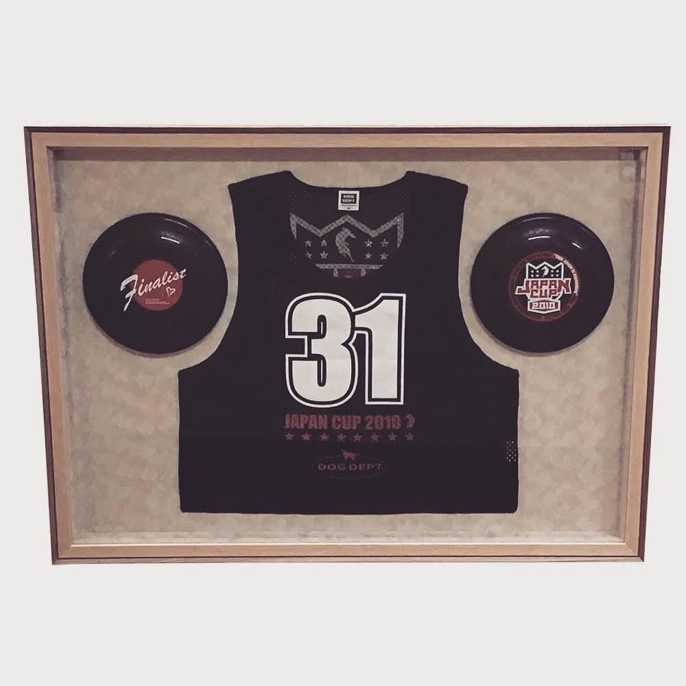 ディスクドッグの大会に出場した時のビブスとディスク2枚を額装しました! 使用フレームは「D-49310(廃番)」、BOX仕様の額で内寸が約630×880mmです。 スエードアイボリーの布を側面と底面に貼ってあります。