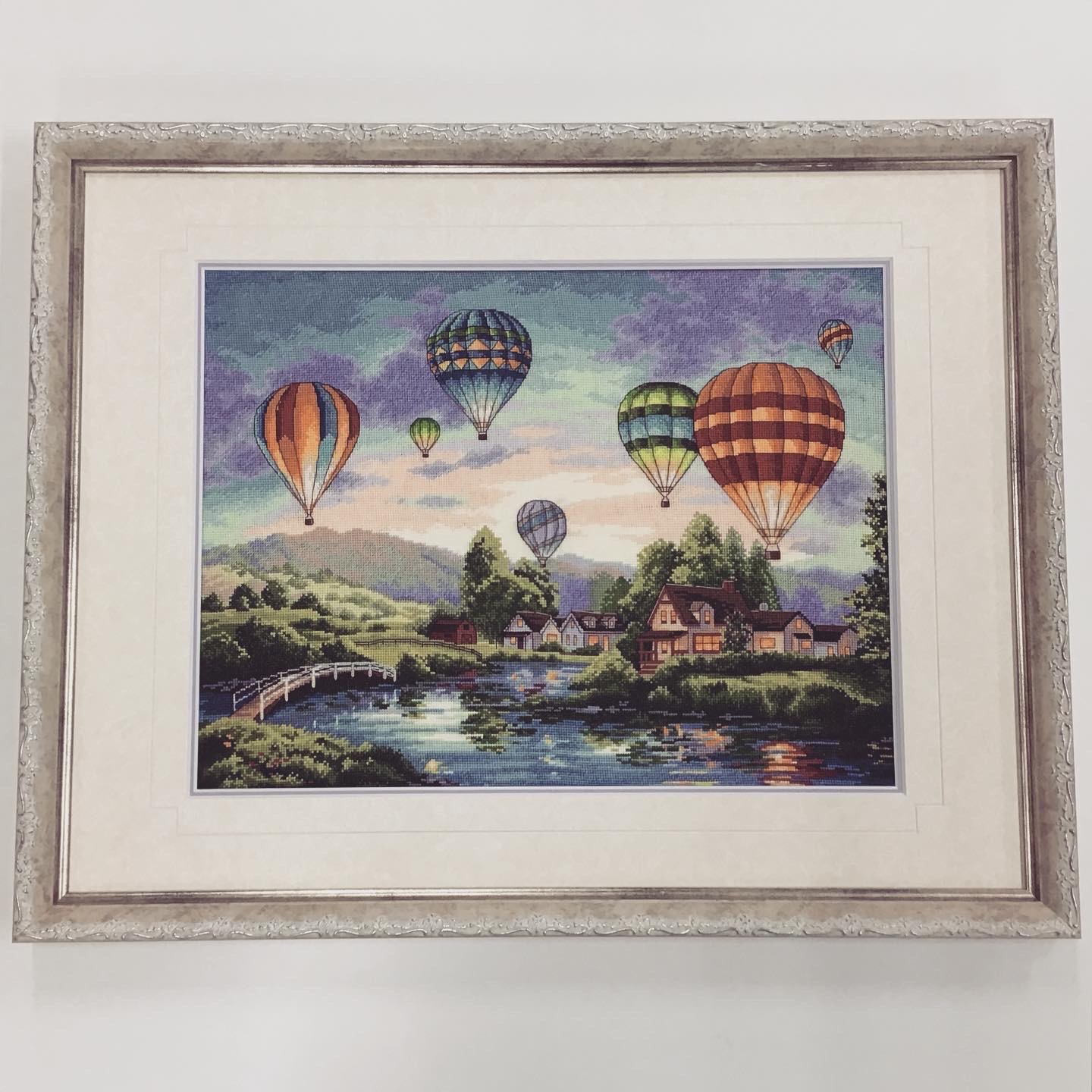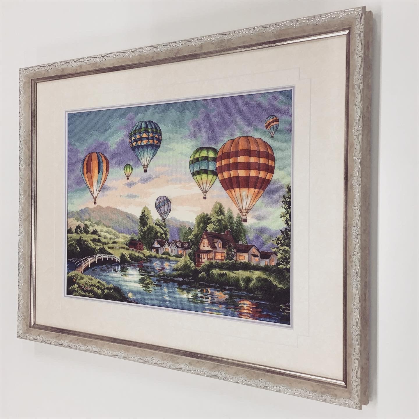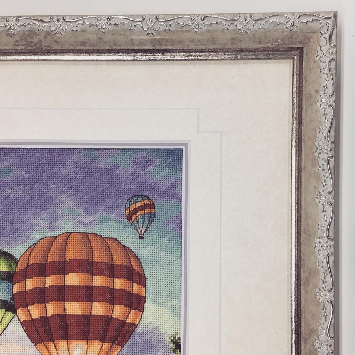 クロスステッチ作品を額装しました! 「気球」は春の季語ということで、テーマは「春」...と、GW期間中に佐久でバルーンフェスティバルが開催されていたりすることもあり、少し暑くなってきた「初夏」のイメージもあるので... 今回のテーマは「春から初夏にかけて」のイメージで額装しました! 使用したフレームは「8214 ホワイト 三々」、マットは少し模様がある白色マット(20101)と薄紫色マット(10772)を組み合わせたWマットです!表のマットにはV溝デザインカットをしました!