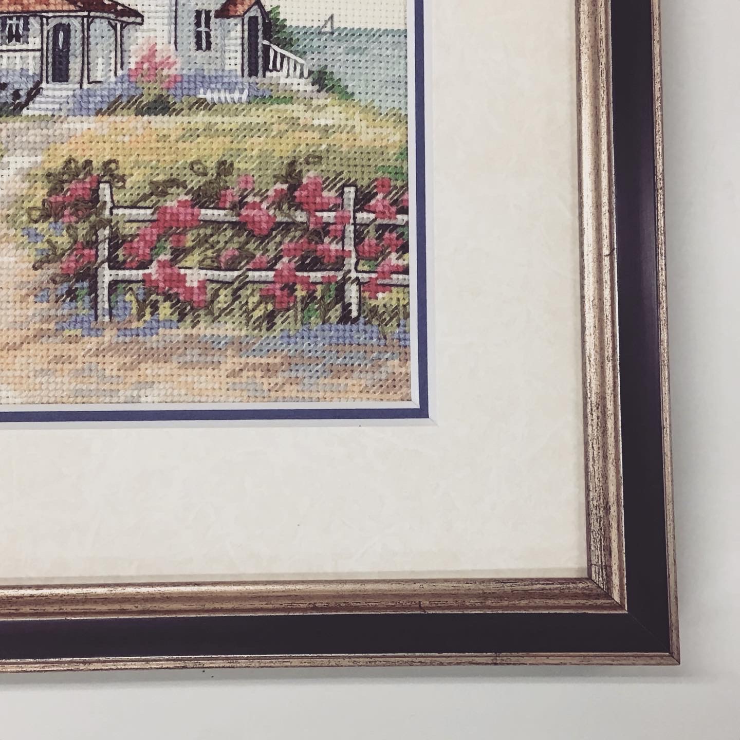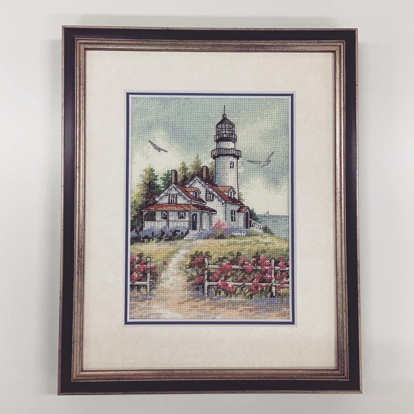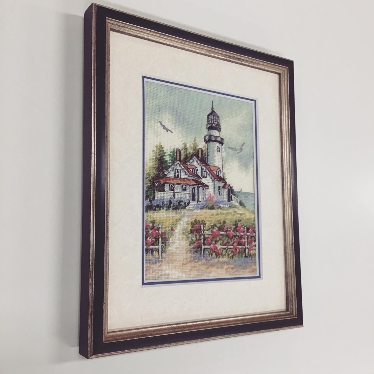 クロスステッチ刺繍作品を額装しました! 灯台と海の景色のクロスステッチ刺繍作品、カモメも飛んでいてとてものどかな風景です。 使用フレームは「サマルカンド 銀青 インチ」、マットは少し模様のある白色マット(20101)と青色マット(10470)です。