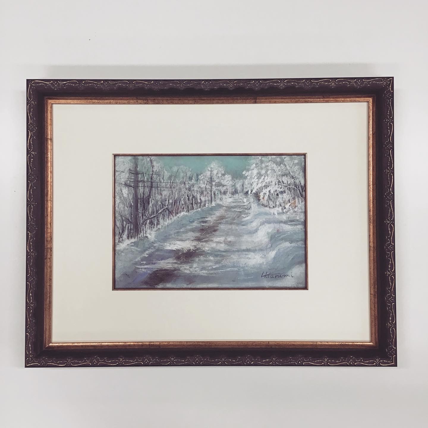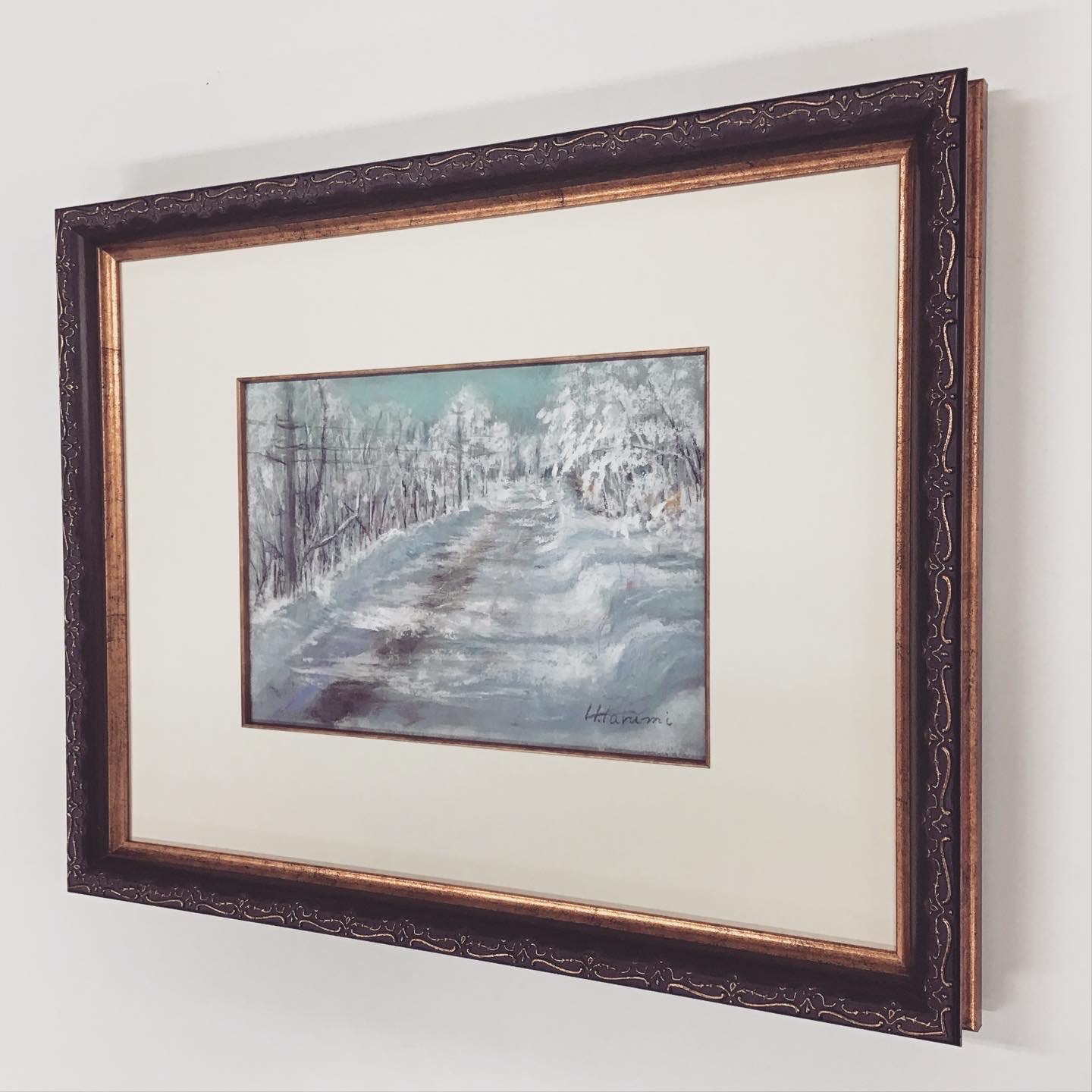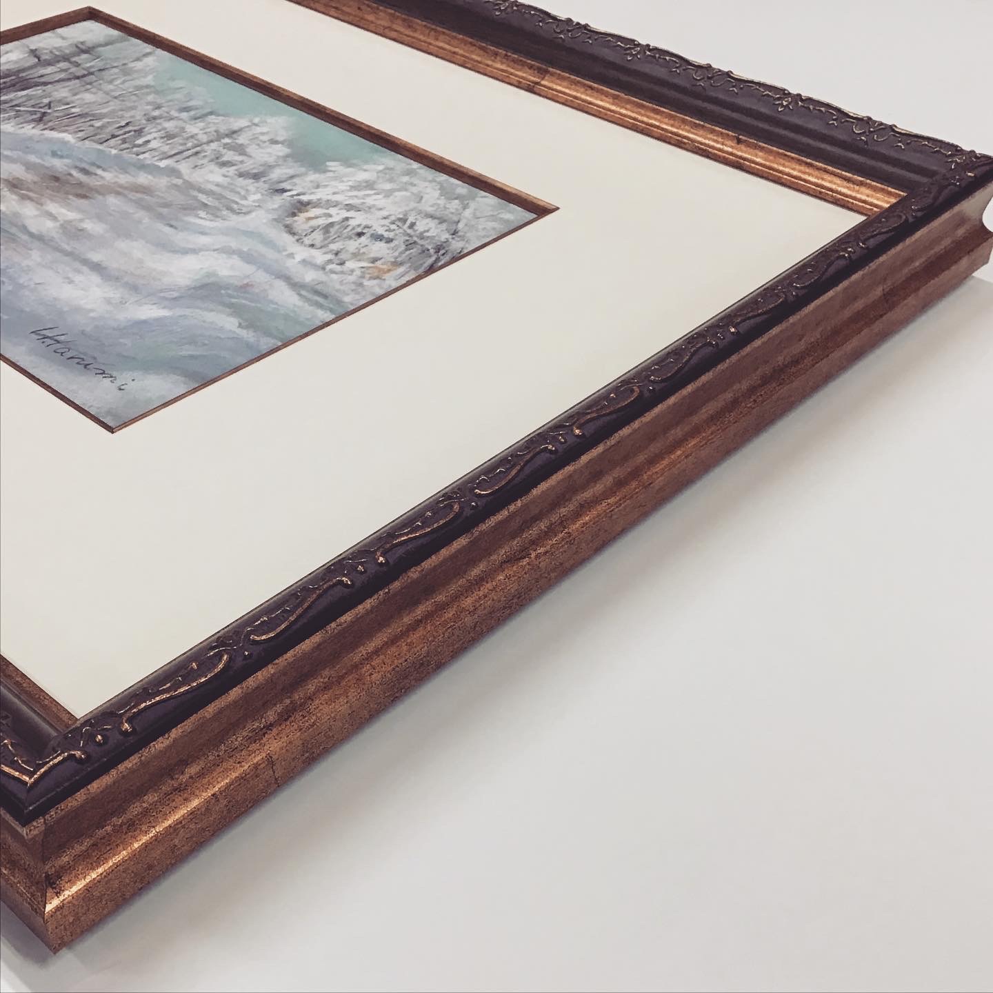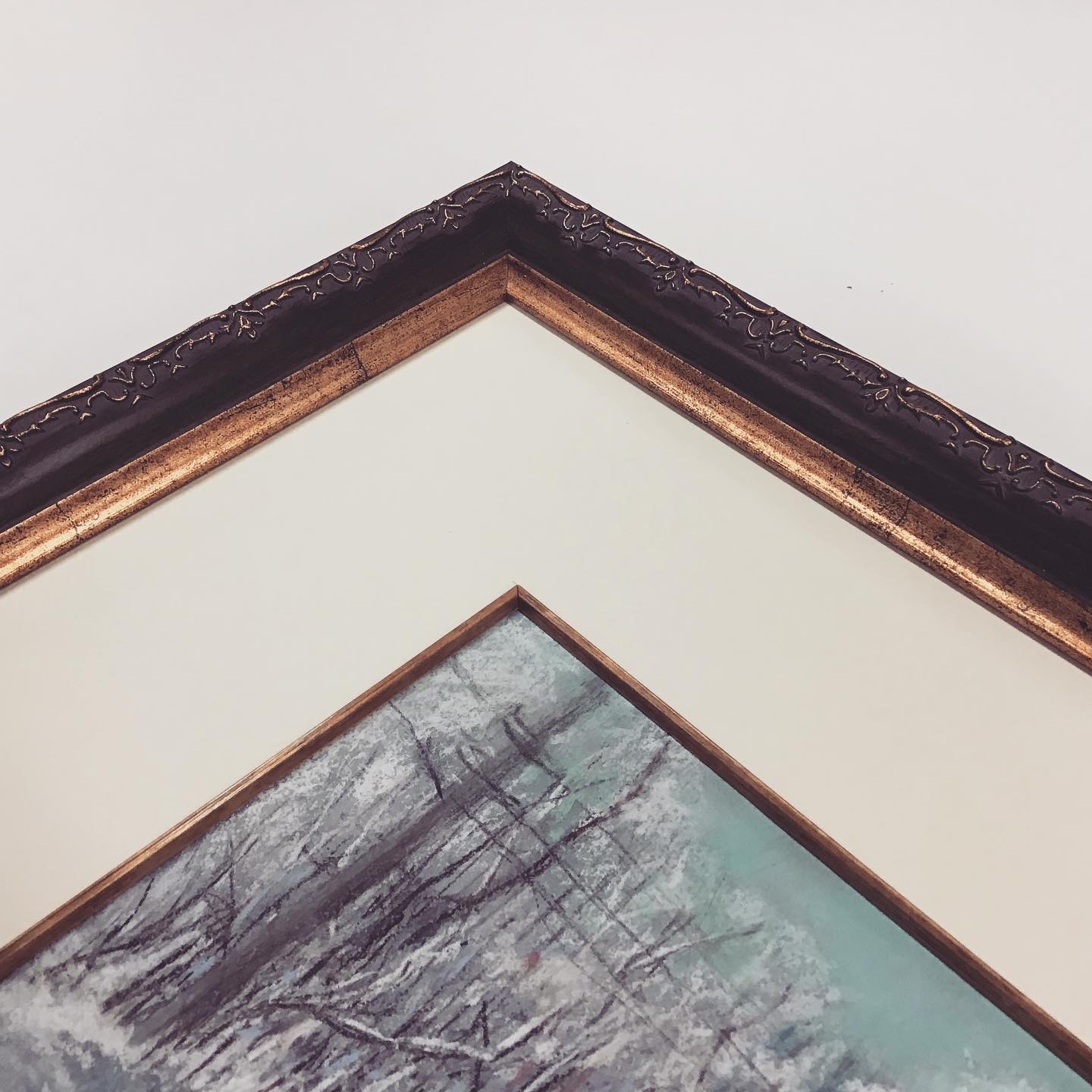 パステル画を額装しました! 使用したフレームはアンティーク調の彫りと深いグリーン色のフレーム「8214 グリーン 太子 」、マットはクリーム色マット(10042)に面金加工をしました。