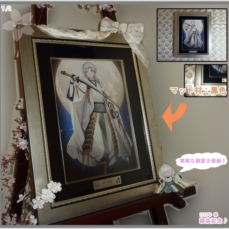 【灯結び展(刀剣乱舞) 複製原画(鶴丸国永)】 額縁等を製作していただきました。 額装後、後光が~より神々しさを増した……神秘的な付喪神様!と感じました。 同作品でも、マット材の色違い(黒と紺)だと雰囲気が異なりますね♪ 素敵な額装をありがとう存じます。