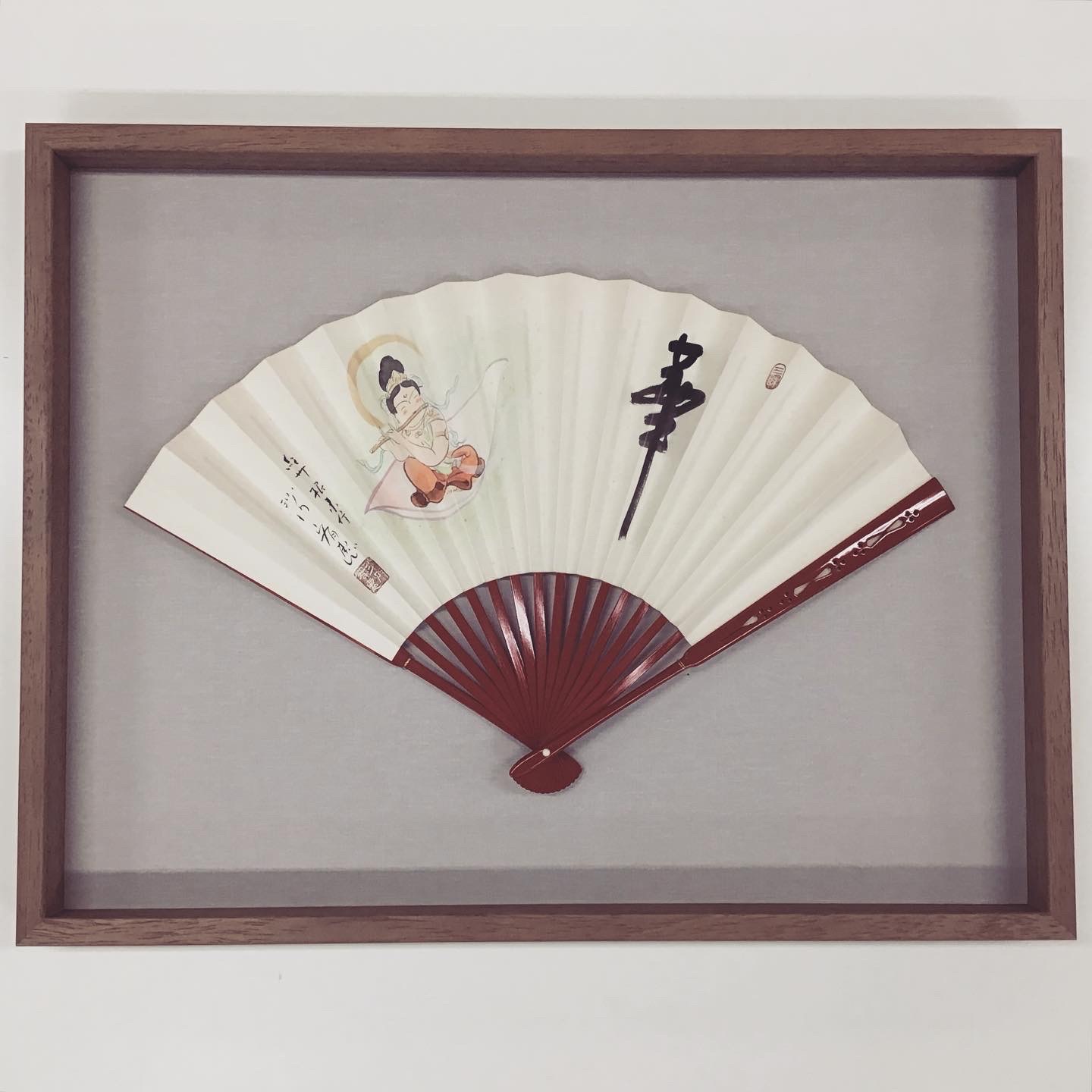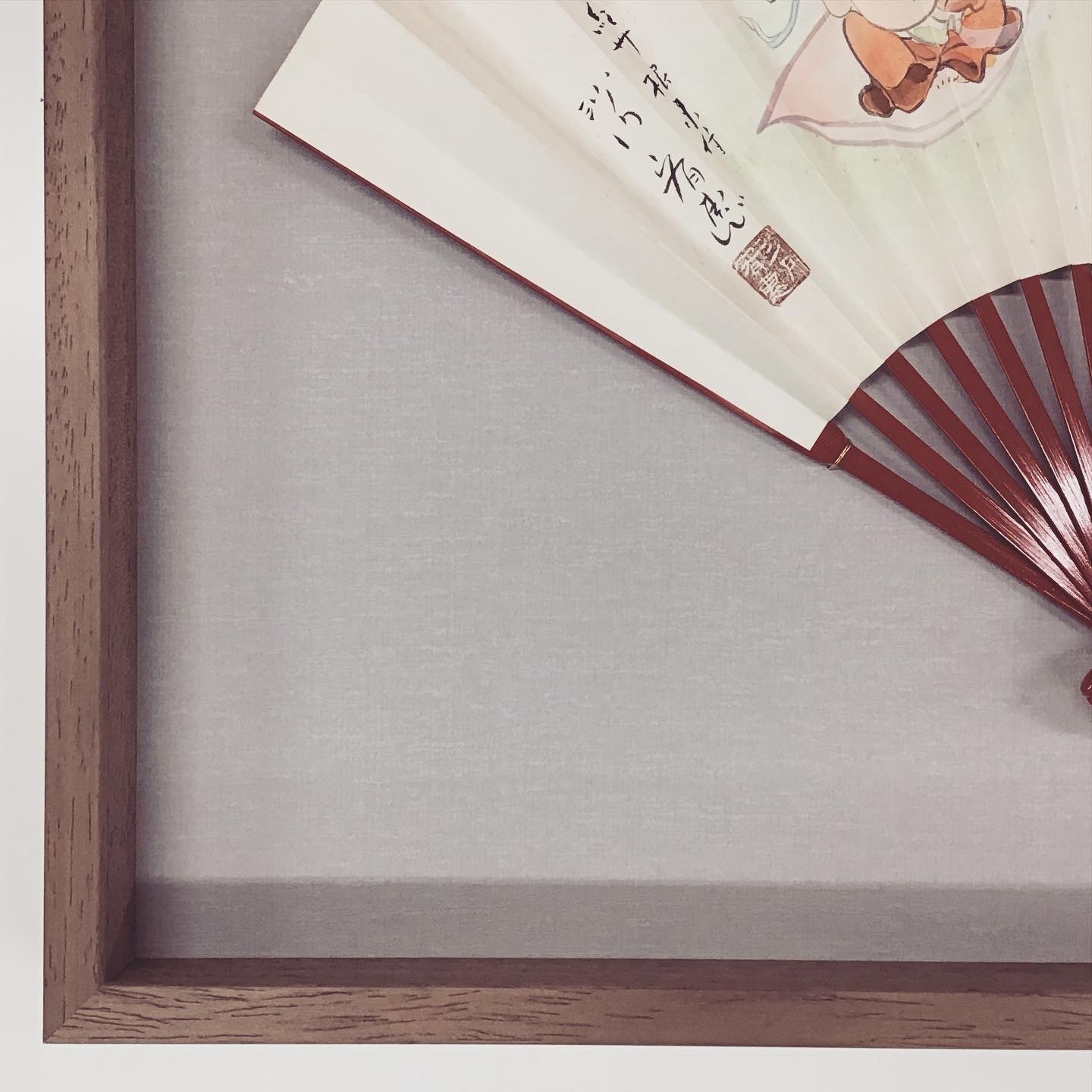 扇子を額装しました! 昔、お客様がお寺のご住職からいただいた扇子だそうです。 使用したフレームは、立体物を額装するのに適した「アートボックス35 パステルブラウン 大衣サイズ」、背景には紫みがかった灰色マット(10513)です。扇子は金色のワイヤーを使い固定してあります。