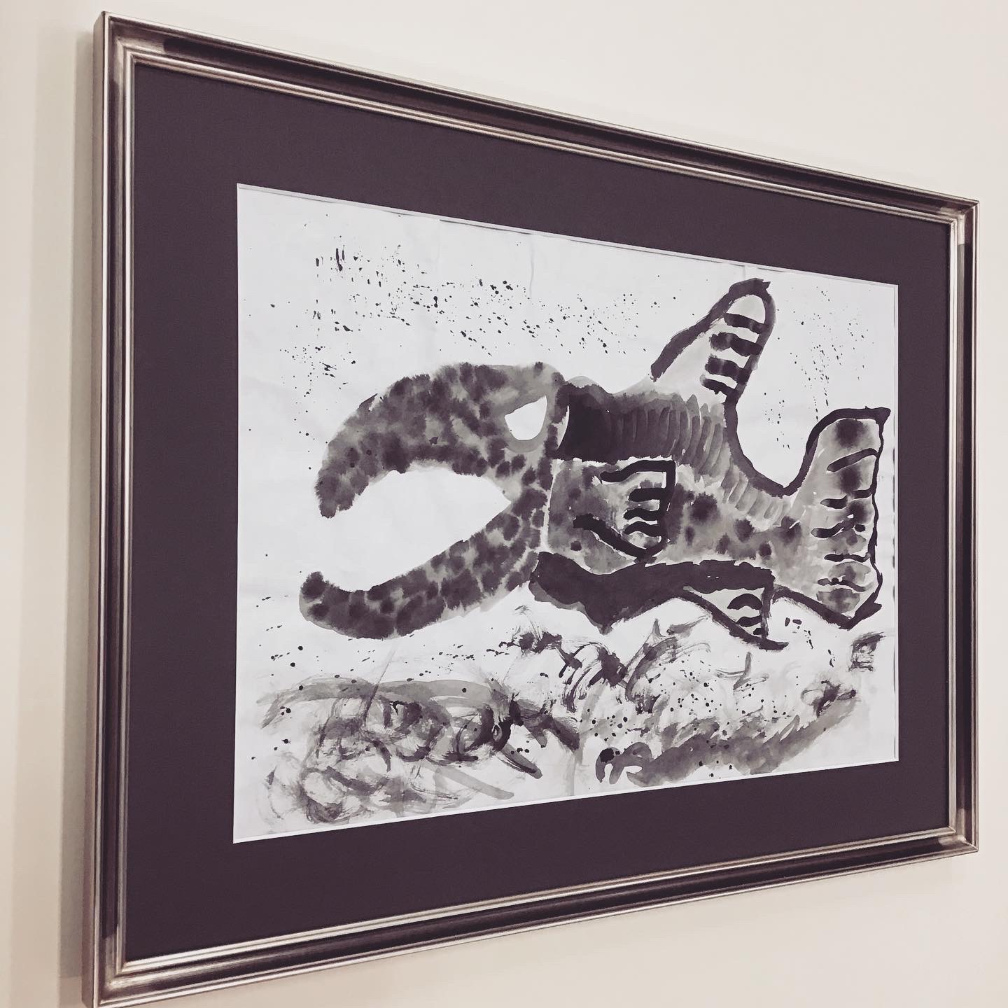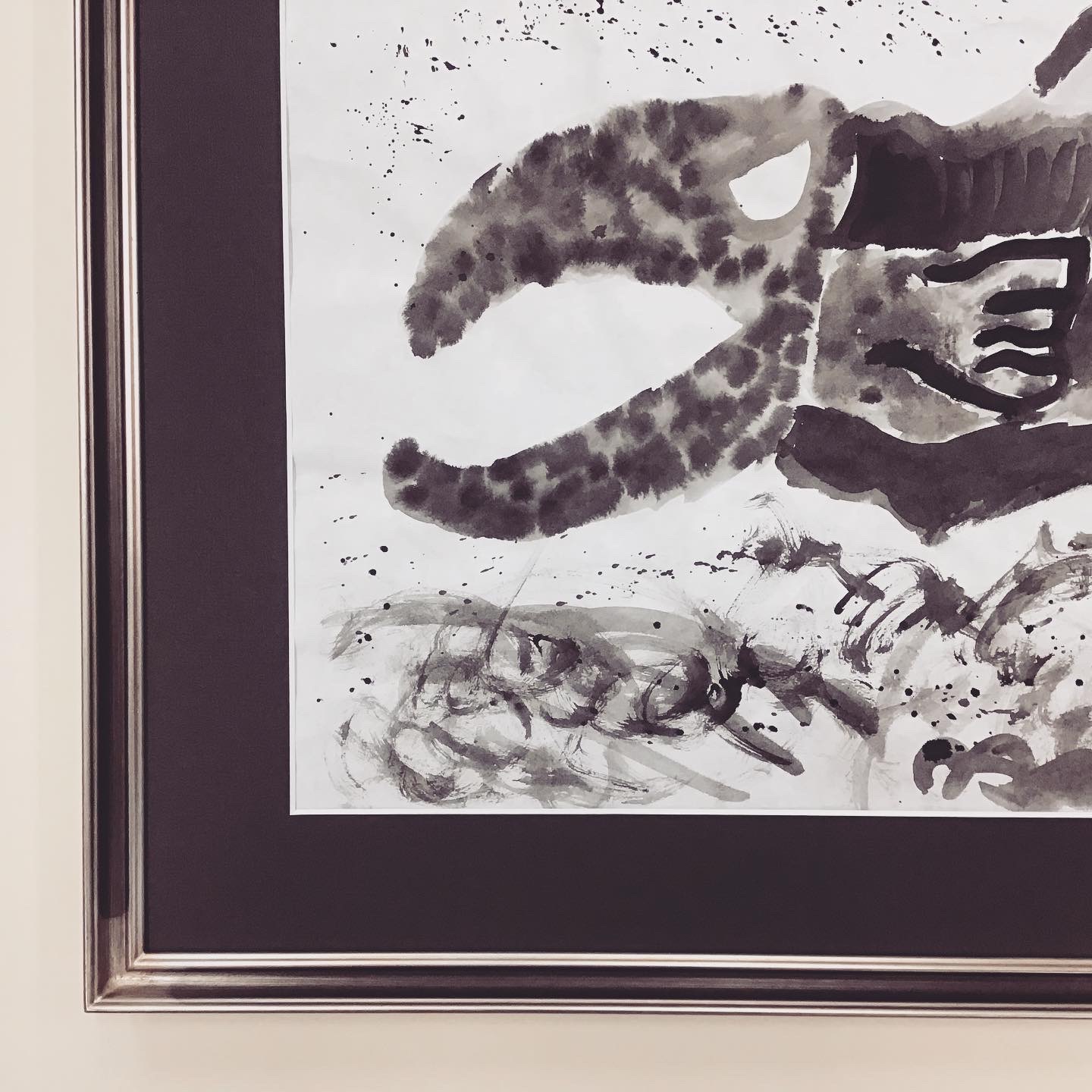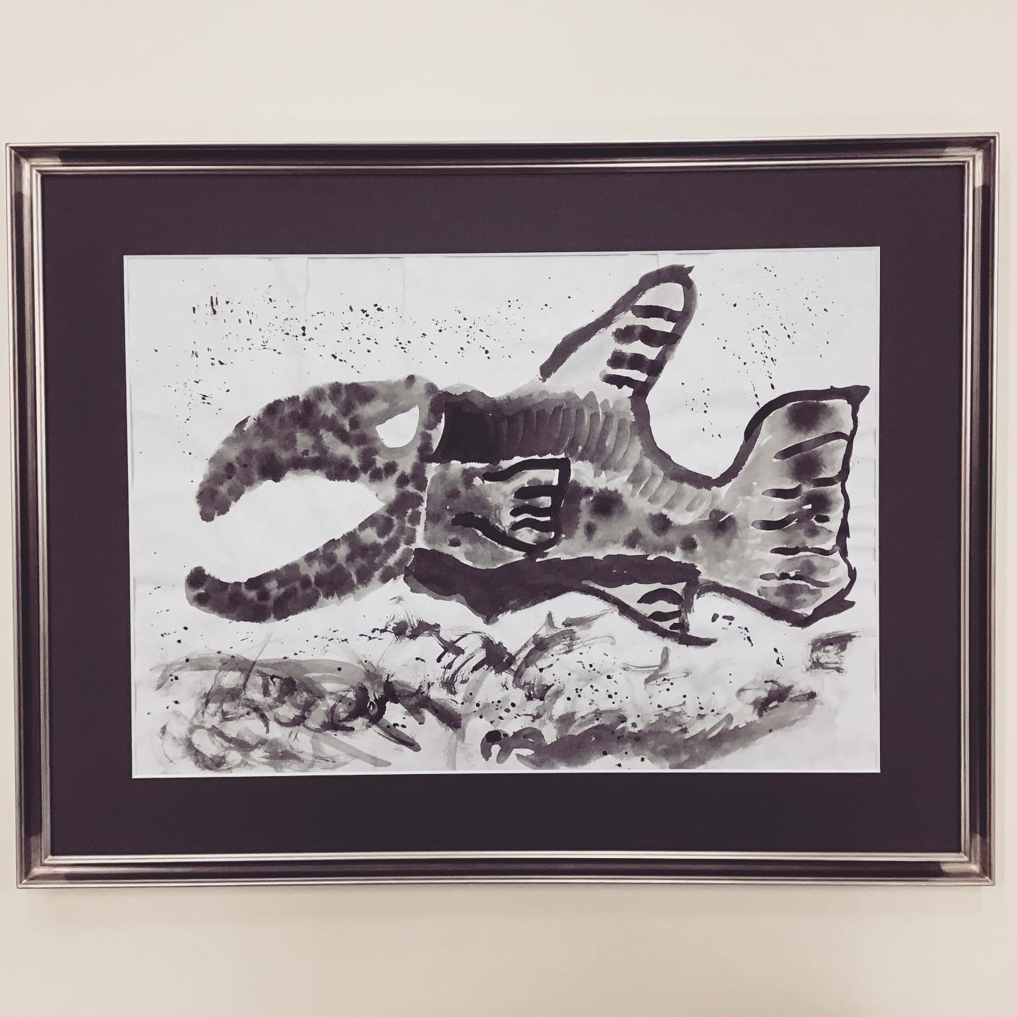 墨絵作品を額装しました。 大きな口を開け、鋭い目つきのお魚の絵です。荒々しい波もよく表現されています。 使用したフレームは「パピルス角紋 いぶし銀 三々サイズ」、マットは墨色のマット(10520)です。