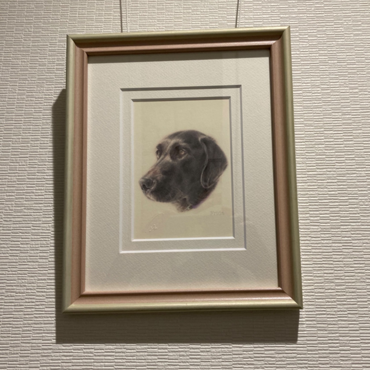 とてもリアルでいながらやさしいタッチの作品ですね🐶あえて同じ色のダブルマットにすることで奥行きが生まれ、作品が引き立っています✨段差幅が通常よりも少し広めなのもポイントです♪