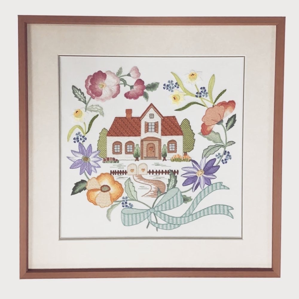 刺繍作品を額装しました! 使用したフレームは「BH-W01 50角 ブラウン」、マットは少し模様のある白色マット(20101)と若草色マット(10013)のWマットです。