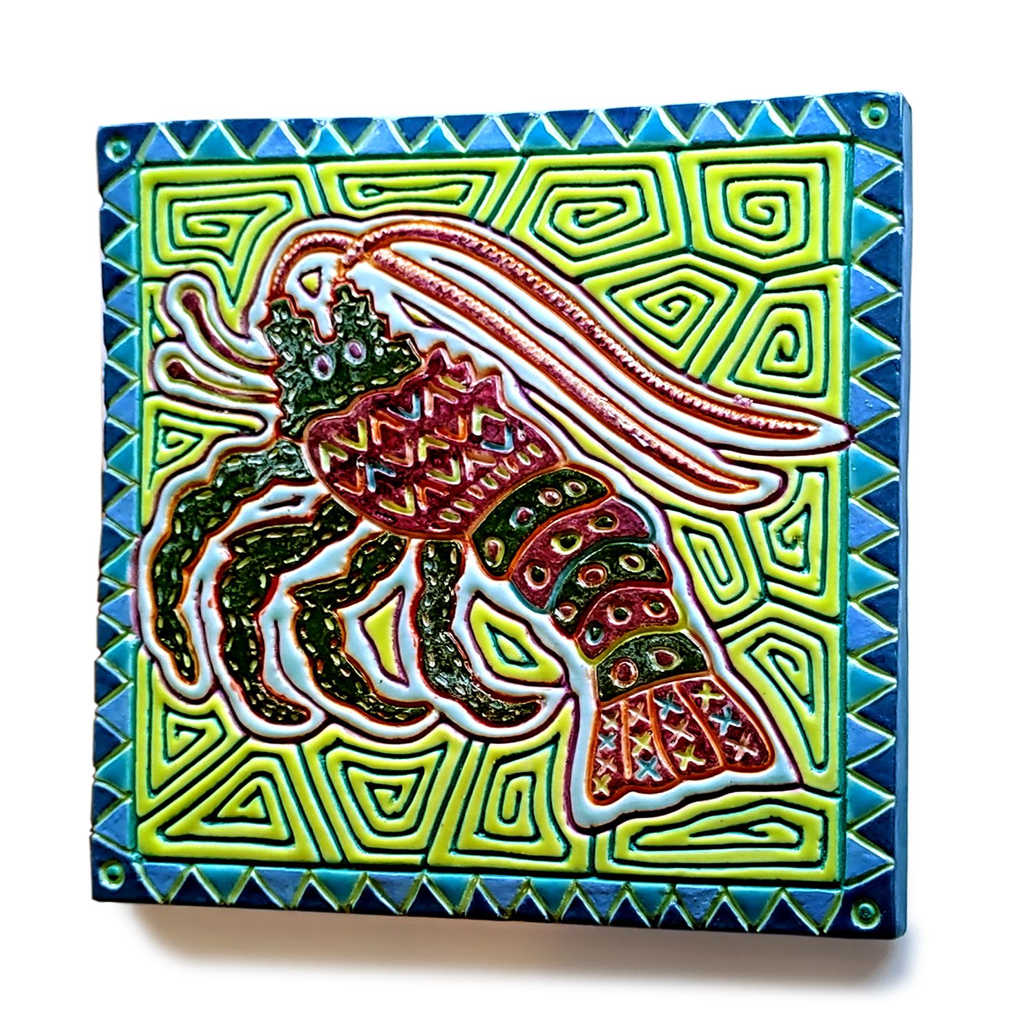 モラ模様の陶板を作成し、既成の正方形の額に入れました。 既成額の内側の板は、他の色の額のものと交換し、変化を持たせました。 大成功!