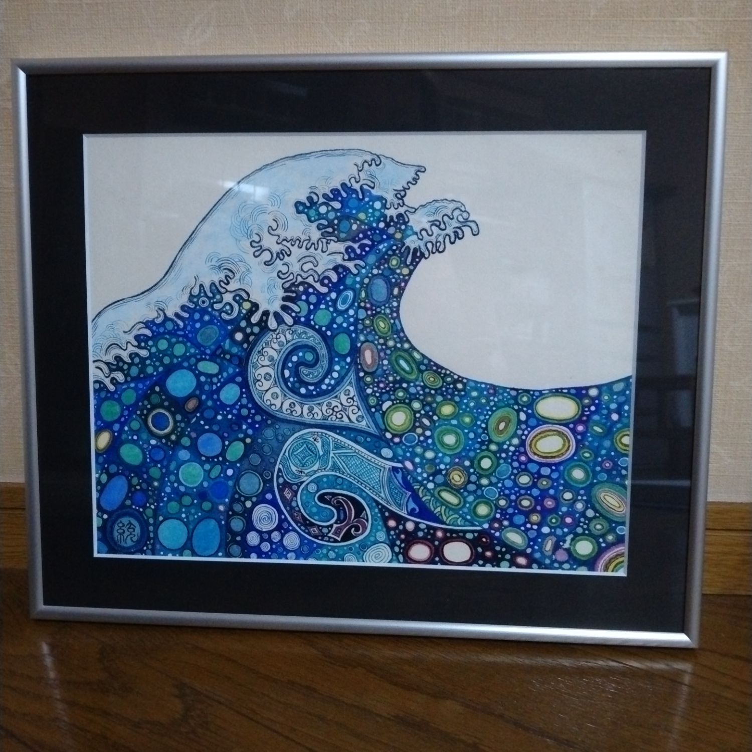 春の海を描きました。和紙に描いたので規格外の大きさでしたが、タカハシさんの額おかげで黒いマットで絵が締まり、とてもよくなりました。ありがとうございました。
