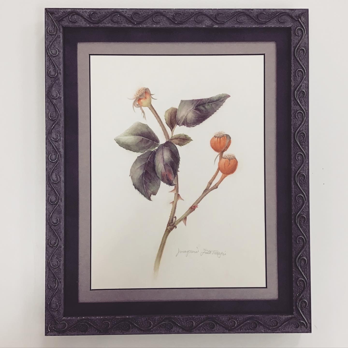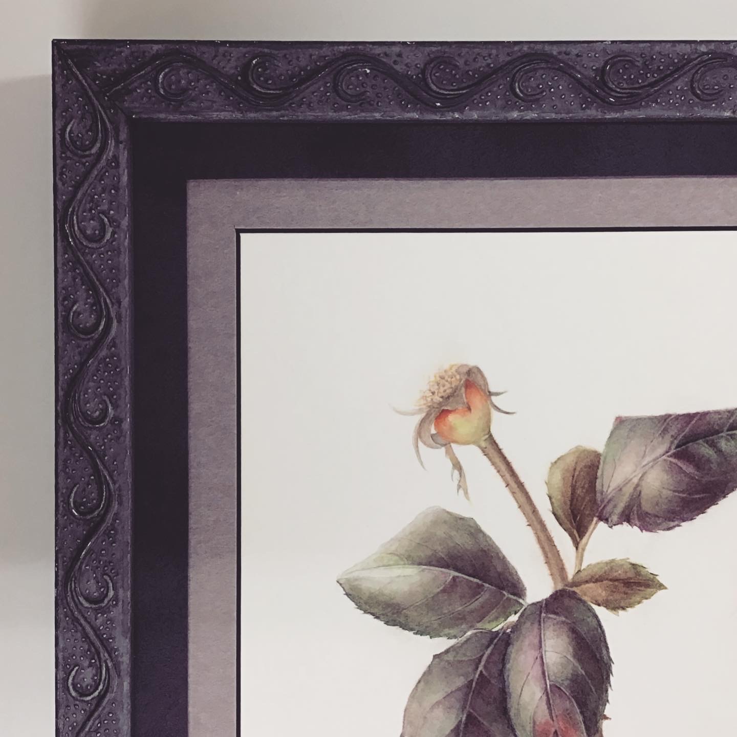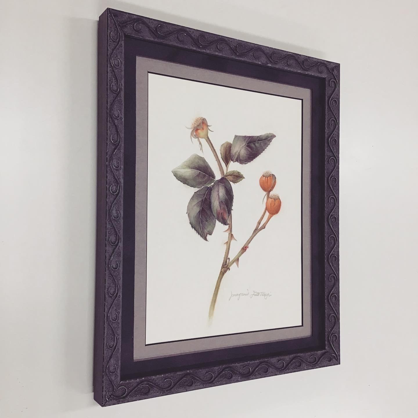 ボタニカルアートを額装しました! 使用したフレームは「ラメール 灰色 八ツサイズ」、マットはスエード灰紫(24608)と黒芯りんどう(12775)のWマットです。