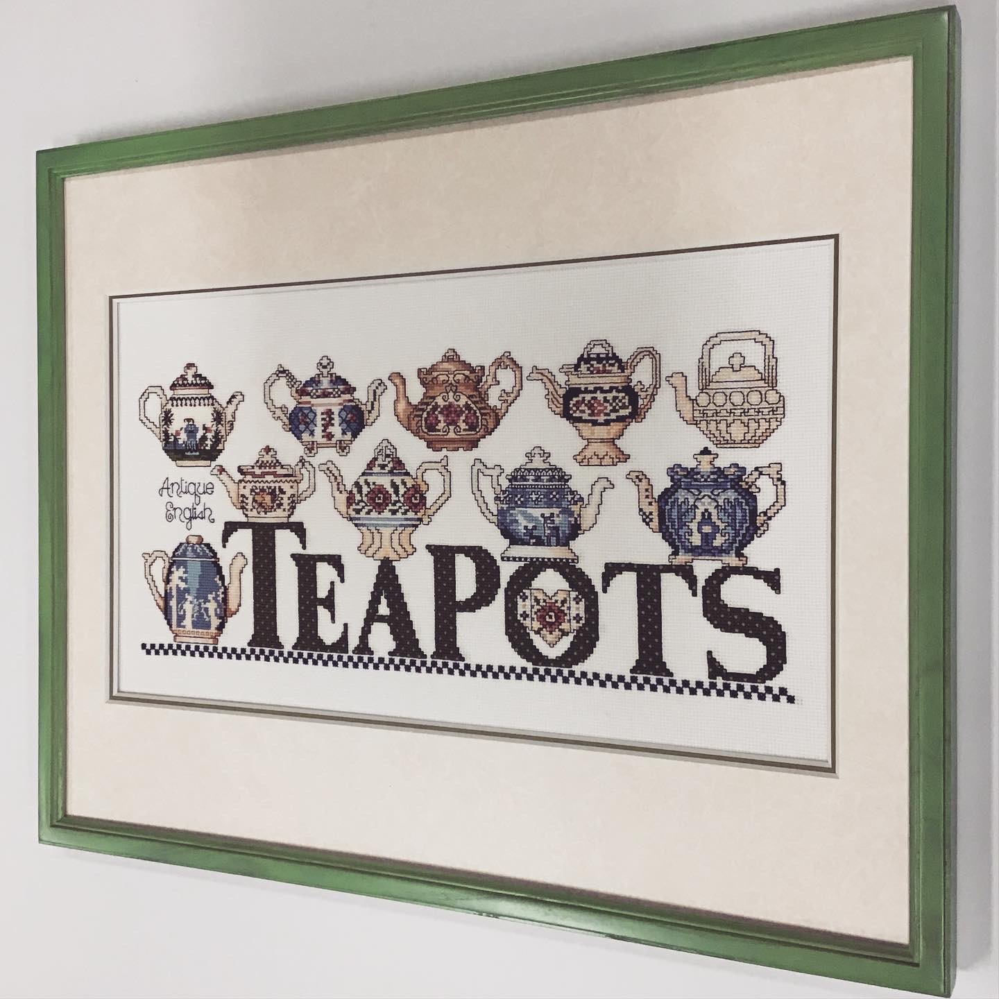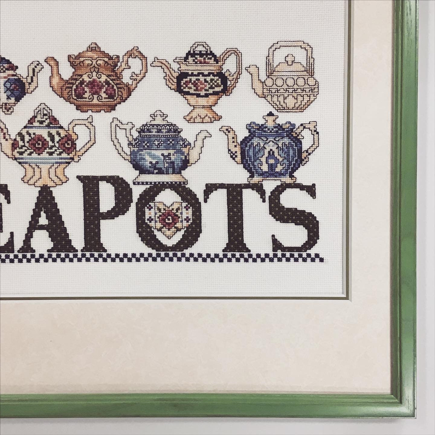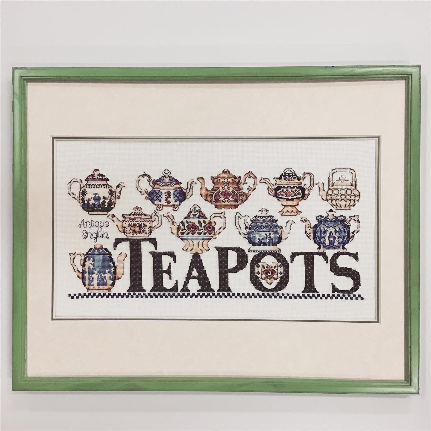 クロスステッチ作品を額装しました! グリーンの細めのフレーム(販売なし)に、マットは少し模様のある白色マット(20101)と明るい緑色マット(10463)のWマットで合わせてみました!