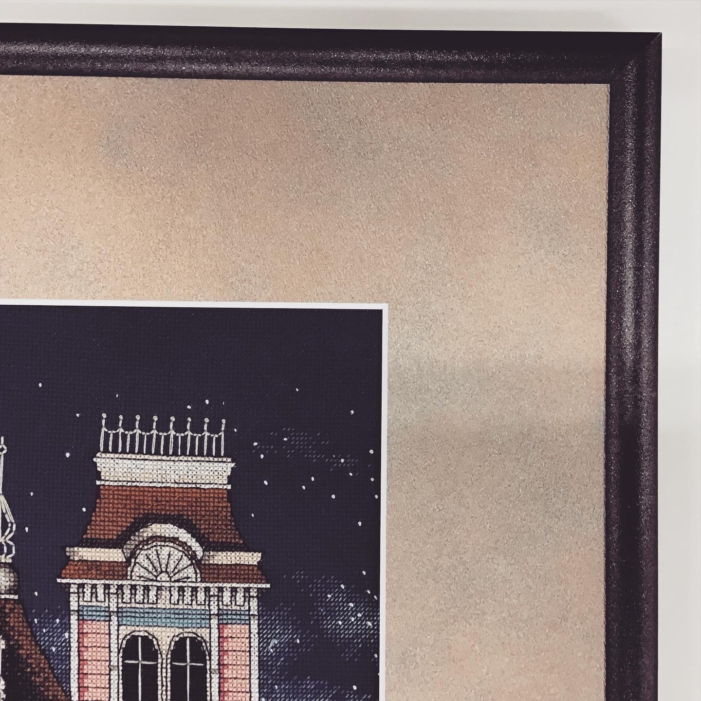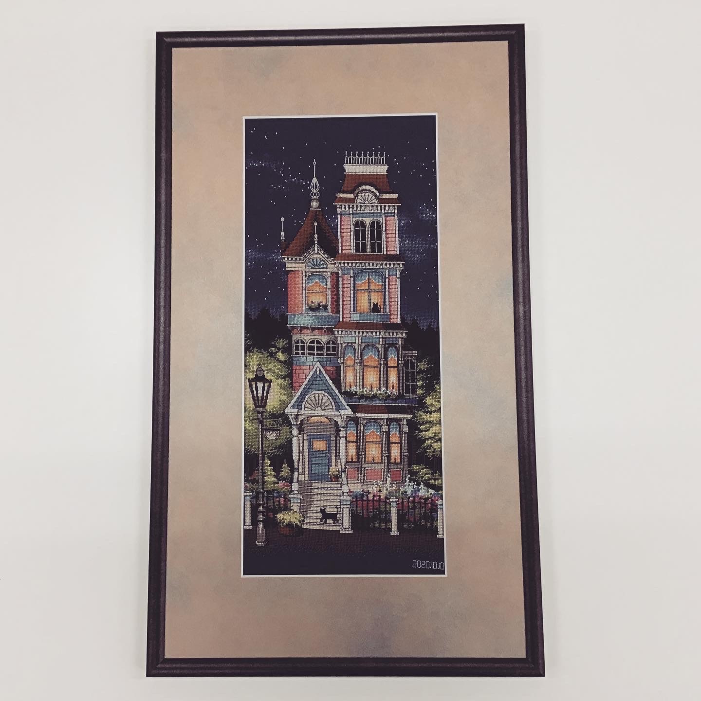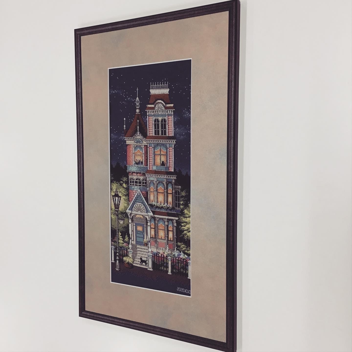 クロスステッチ刺繍作品を額装しました! 塔のような家からは暖かい灯りが見えます。3階の窓際の黒猫と玄関の外にいる黒猫がお互い見つめあって見えるのは私の気のせいでしょうか? 使用したフレームは「YFMフレーム 宗達 348×606mm」、マットは鈍い銀色マットを使用しました。