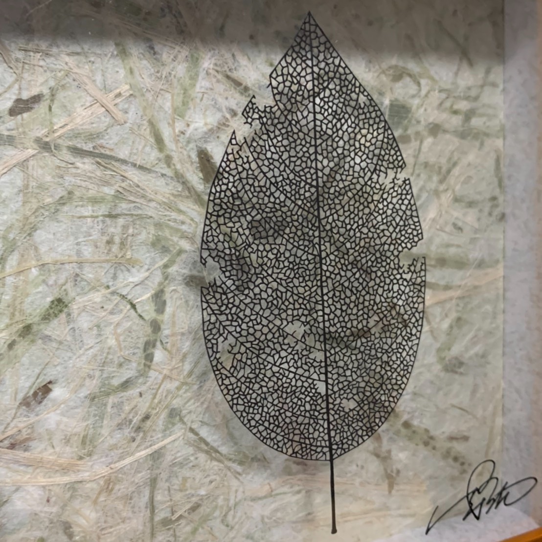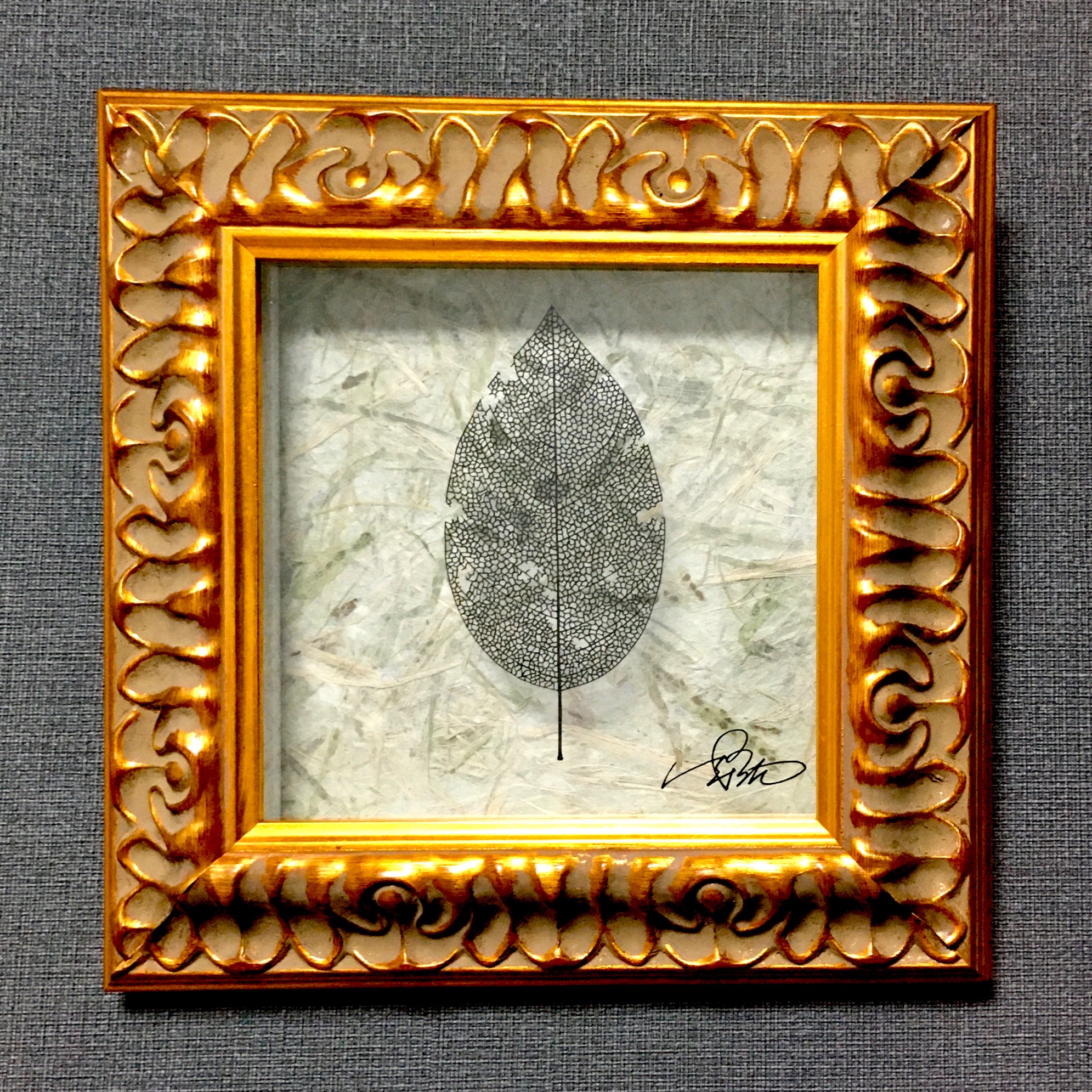自身の作品でございますこちら「虫食いの葉」です。 いつも額縁はタカハシ様で購入しており、特注や細かい要望にも応えてくれていつも助かっております。