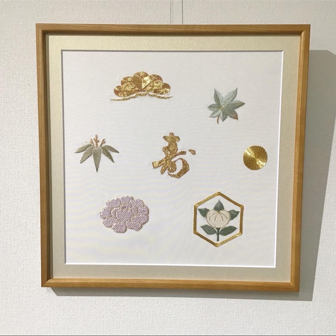 『日本刺繍額装』 とてもに丁寧に刺された日本刺繍🪡 大事に丁寧に刺されたのが伝わってきます🌼 •使用フレーム L型 木地/40角 •使用マット 砂金 20208 砂金のマットは、上品に仕上げたい時にオススメのマットです😊