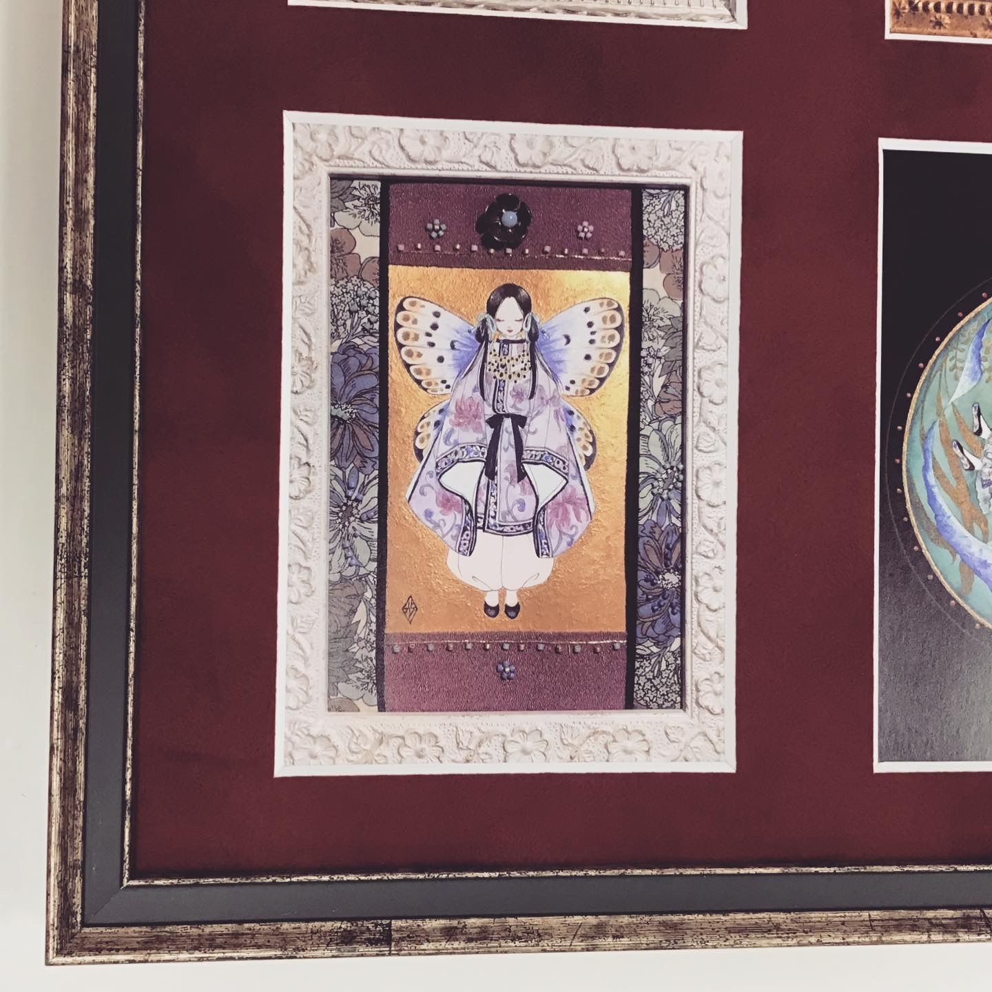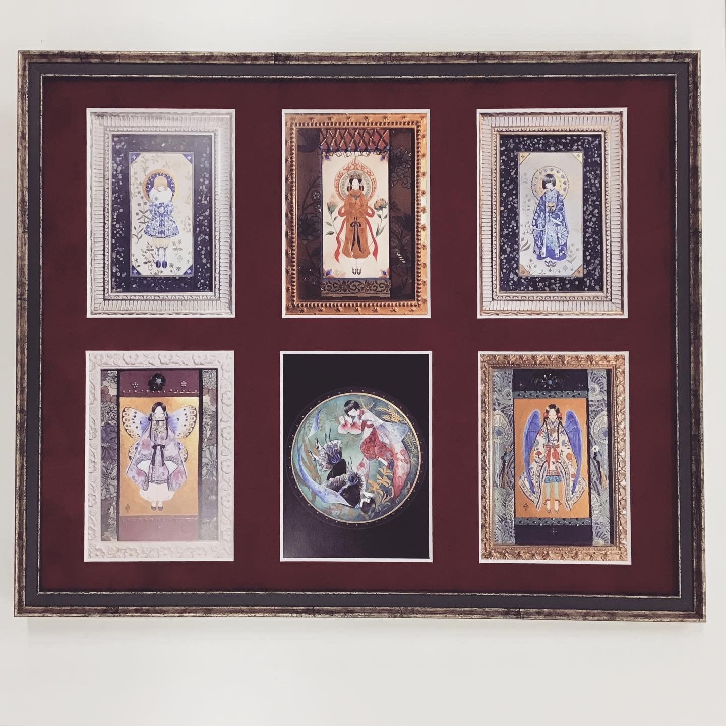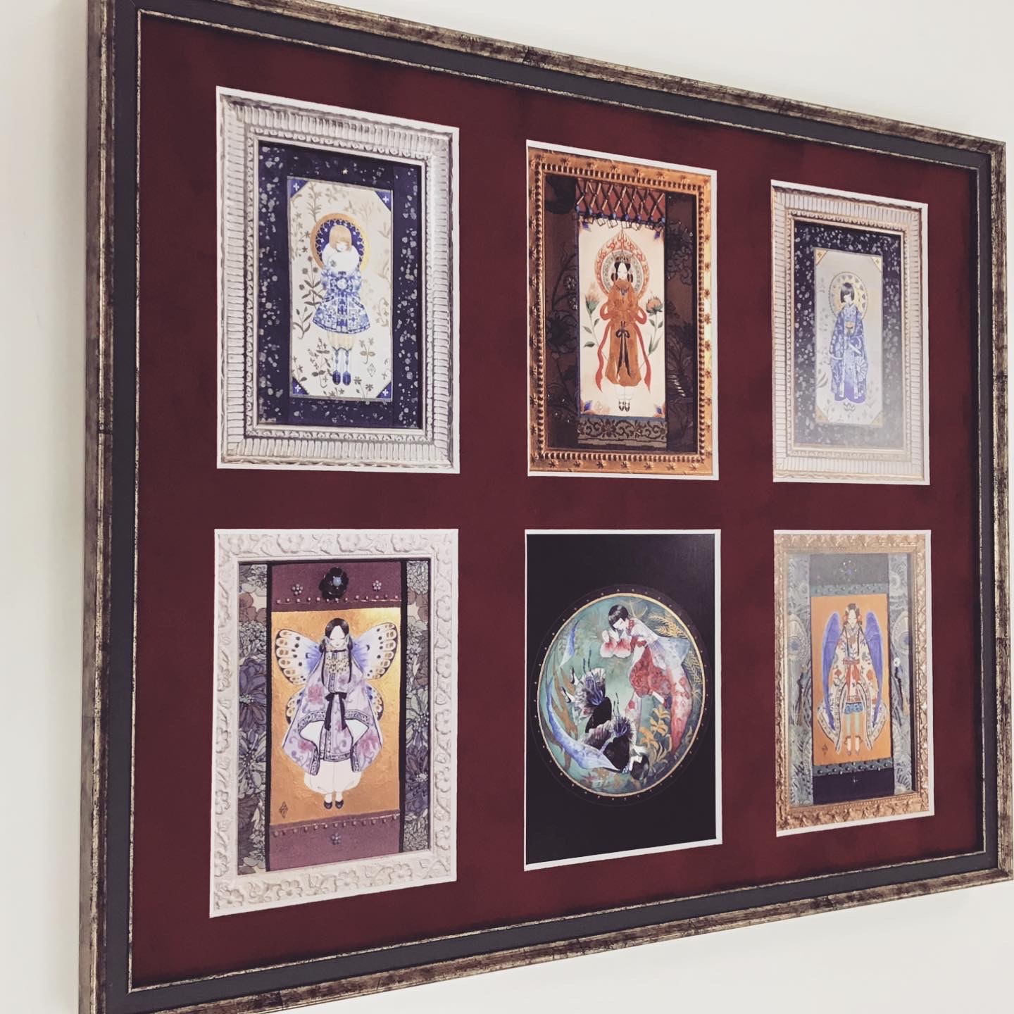 「眠り箱」ポストカードを額装しました! 使用したフレームは「5902 Sグリーン 四ツサイズ」、マットはスエード赤マット(24605)で、ポストカードごとに窓抜きをしました!