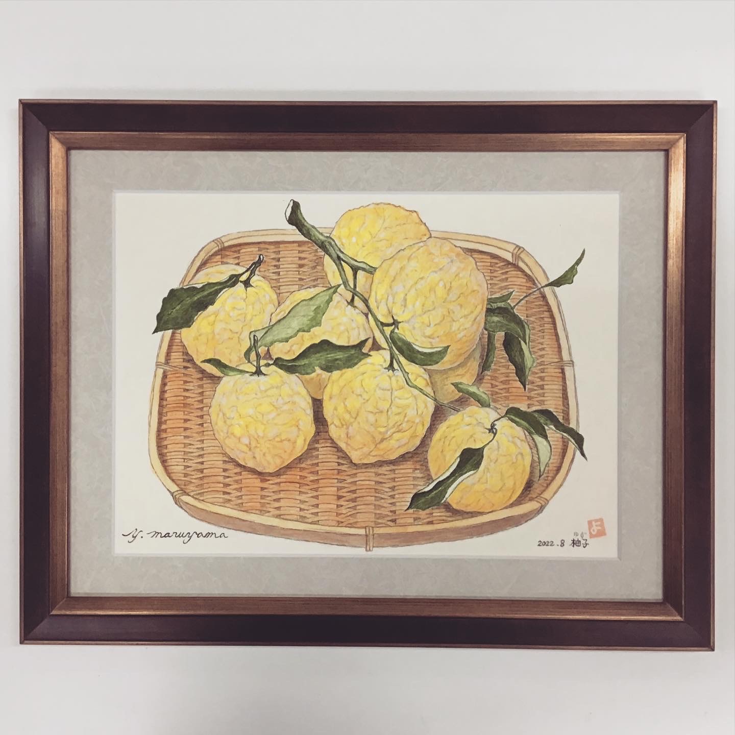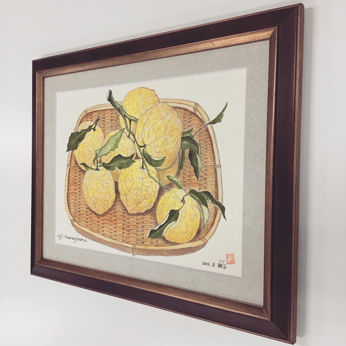 水彩画を額装しました! 描かれているのは「柚子」...柚子の綺麗な黄色と凸凹とした質感がよく描かれています。柚子の爽やかな香りが香ってきそうです! 使用したフレームは「アルパイン 金茶 太子サイズ」、マットは少し模様のあるグレーのマット(20103)です。