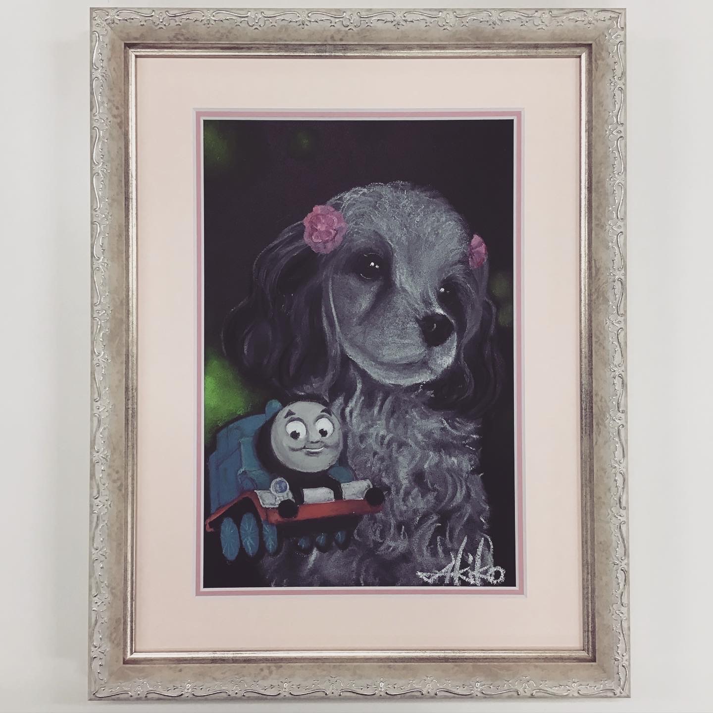 チョークアート作品を額装しました! お客様が #錦鯉野アキコ 様という黒板アートを中心に活動されている作家さんに依頼された作品です。 描かれているのは、お客様の今は亡き愛犬「パティちゃん」です。昔飼っていた子で、15歳の長生きさんだったそうです。亡くなって数年経っていますが、26歳の息子さへのサプライズプレゼントとして、錦鯉野アキコ様に依頼されたそうです。 息子さんは物心ついた頃からずっと一緒にいたパティちゃんが大好きだったとのこと。今も一人暮らしされている部屋にはパティちゃんの写真があるそうです。 今回額装させていただいた黒板画にはパティちゃんと小さい頃の息子さんが大好きだったトーマスが描かれています。 使用したフレームは「8214 ホワイト 太子」、マットは薄いピンクのマット(11650)と濃いピンクのマット(11273)です!
