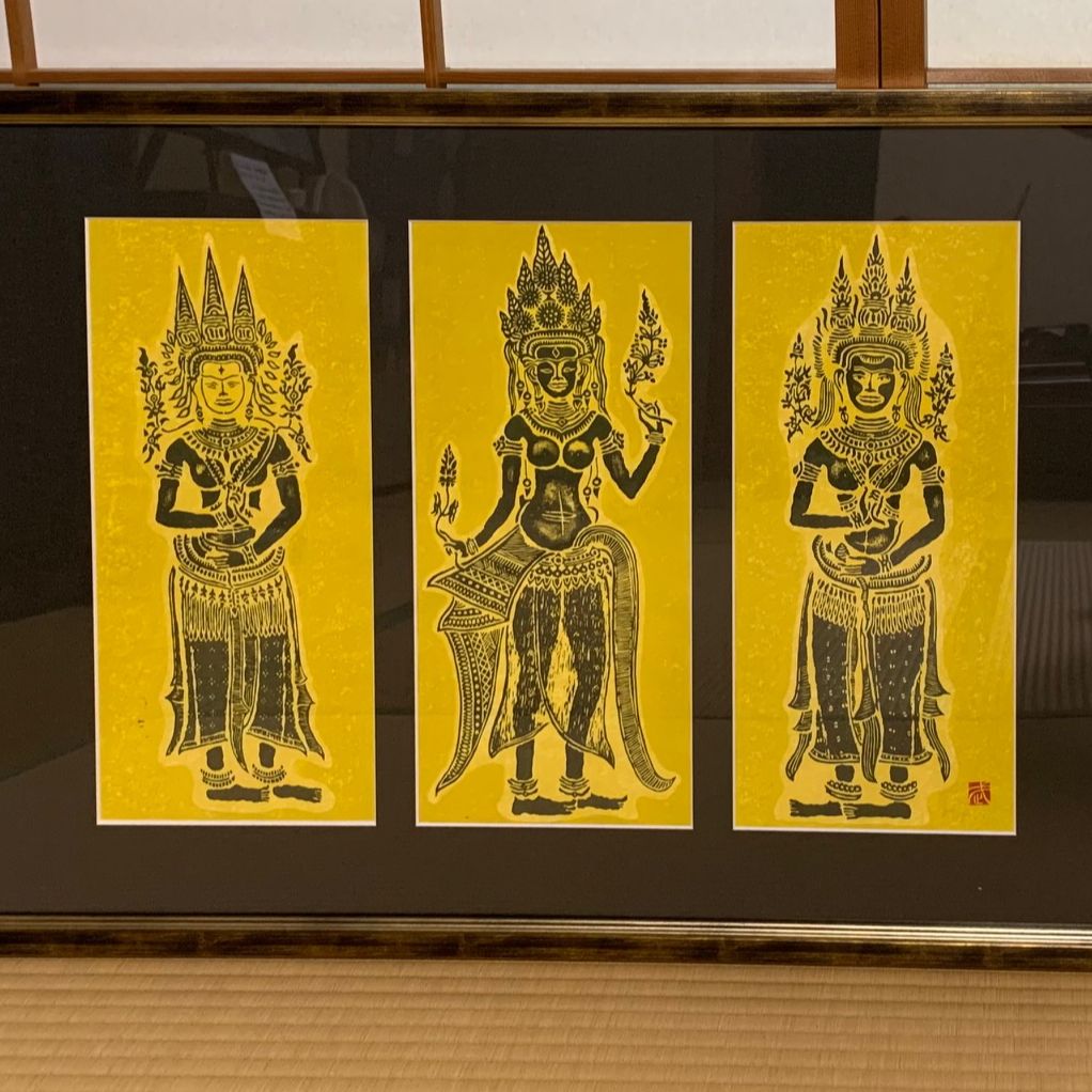 木版画「クメールの女神たち」を三窓抜きの墨色マットで額装しました。額縁は545×795ミリの特注サイズ、作品とマットと額縁の色合いがうまくマッチしました。アンコール・ワットのレリーフの拓本をテーマにした三作目です。