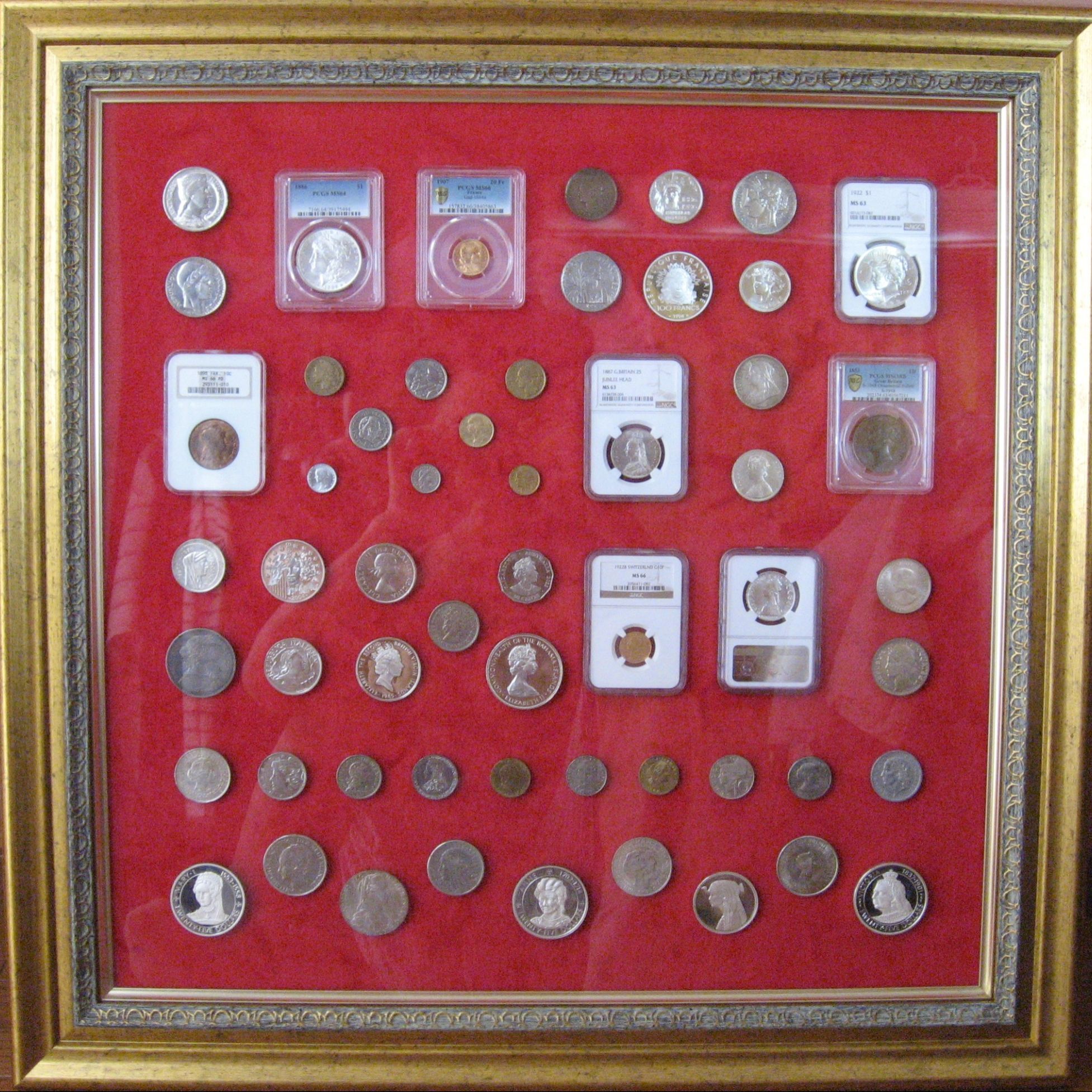 女神・女王・美人・美少女のコイン56枚を額装しました。半年余りの間に6回の追加や配置換えを行い、近いうち更に4枚を追加する予定です。