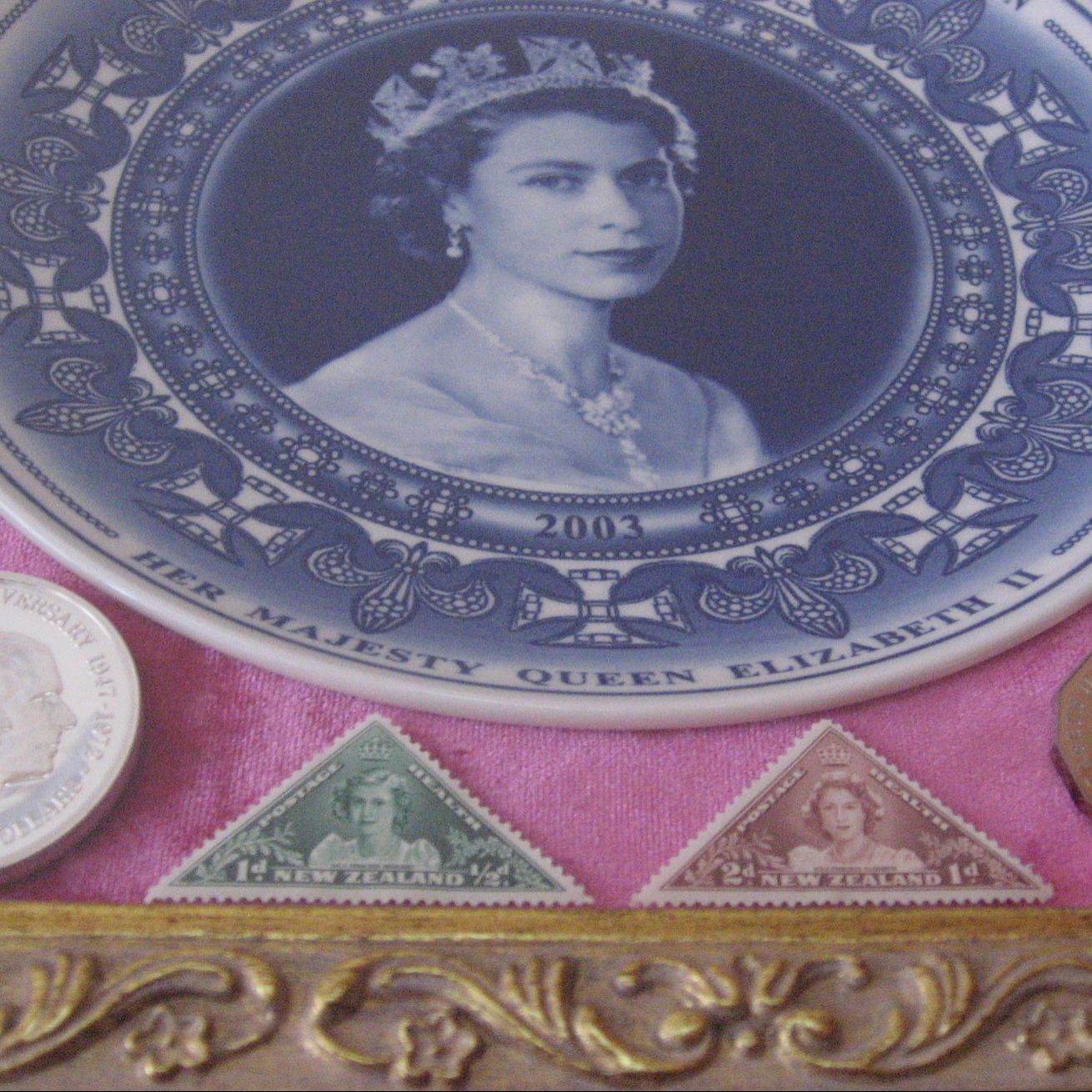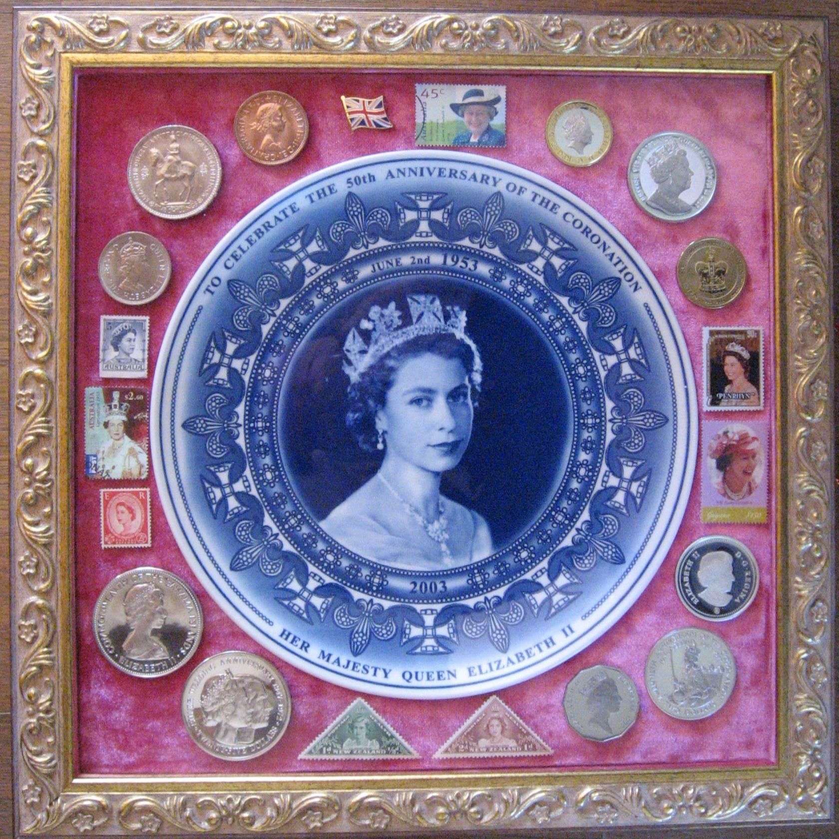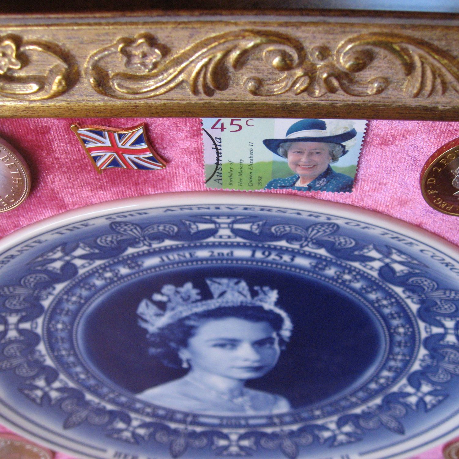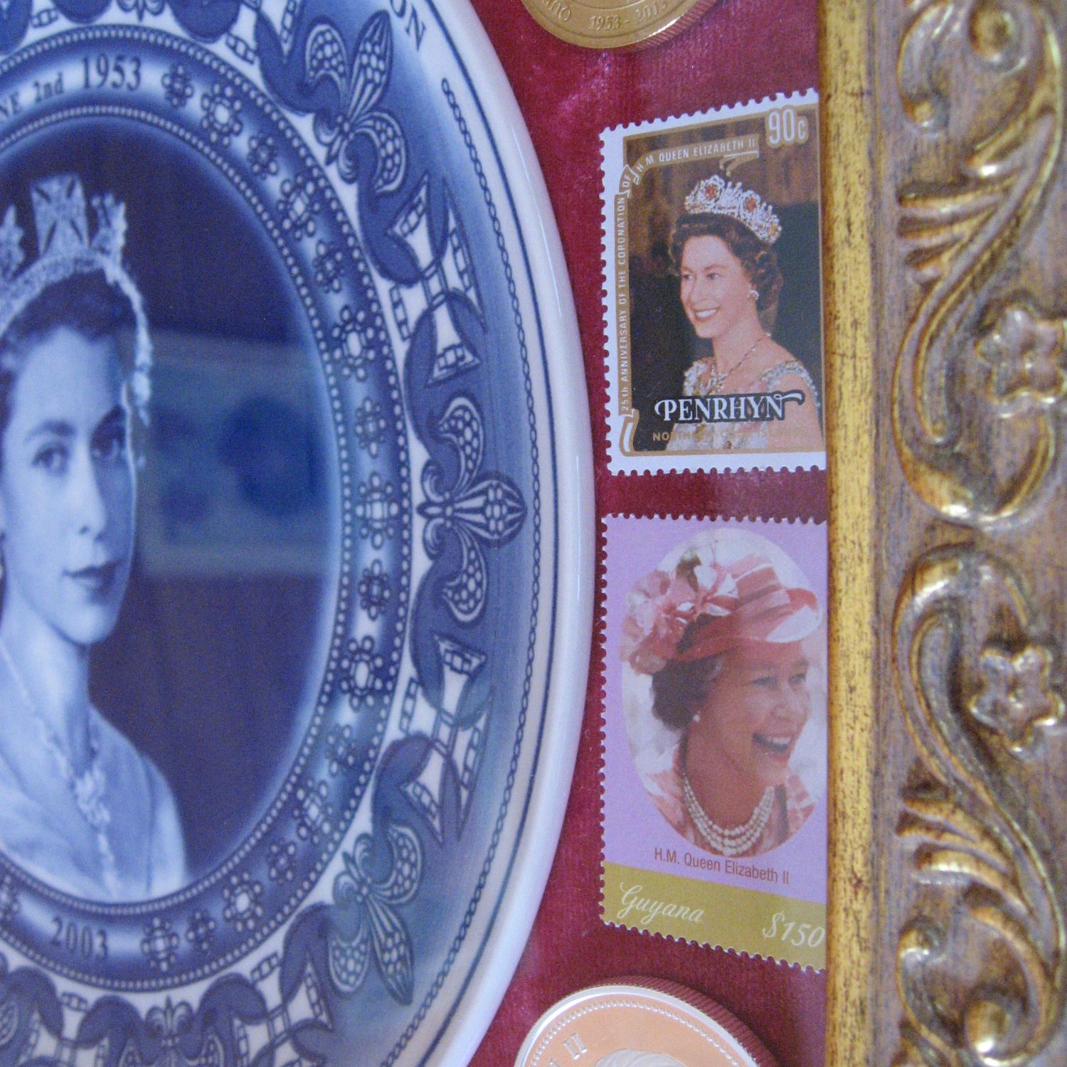 女王エリザベス二世の絵皿とコインを額装しました。初めは絵皿とコインだけでしたが、切手を追加したら更に華やかな楽しいものになりました。