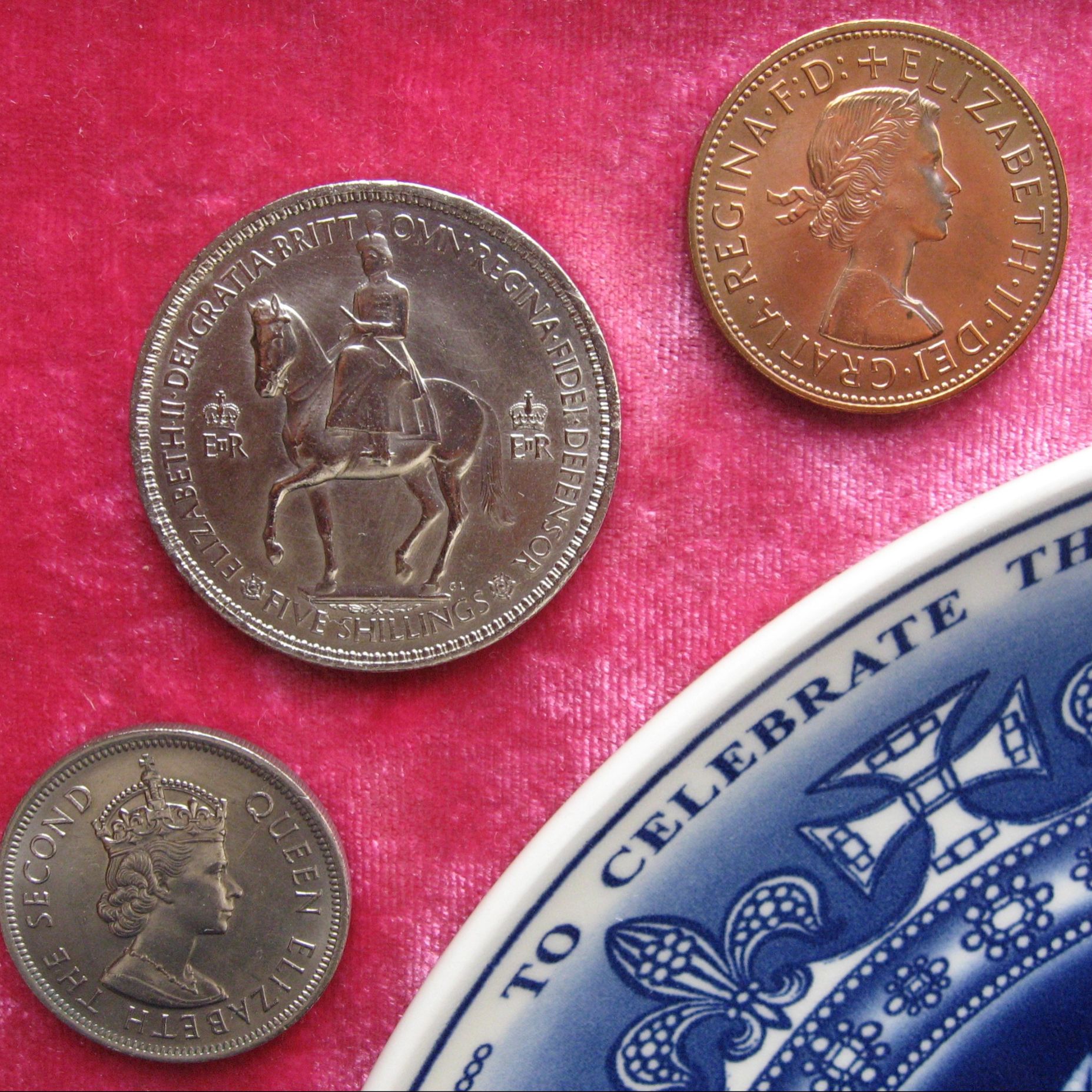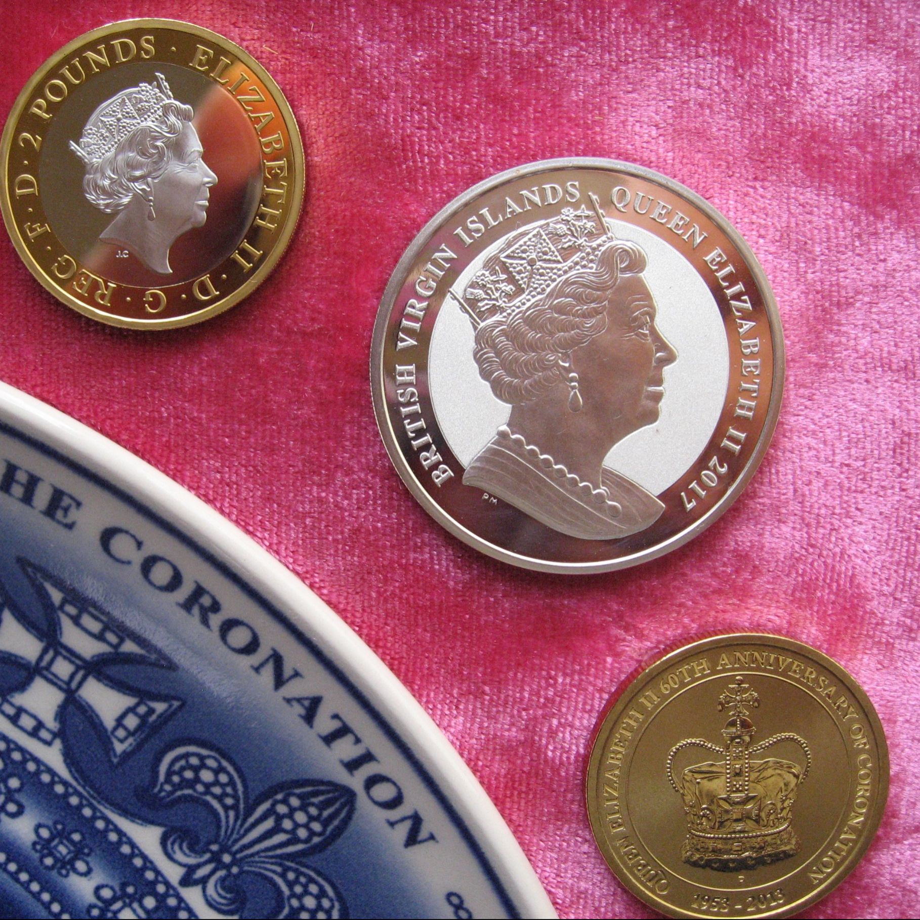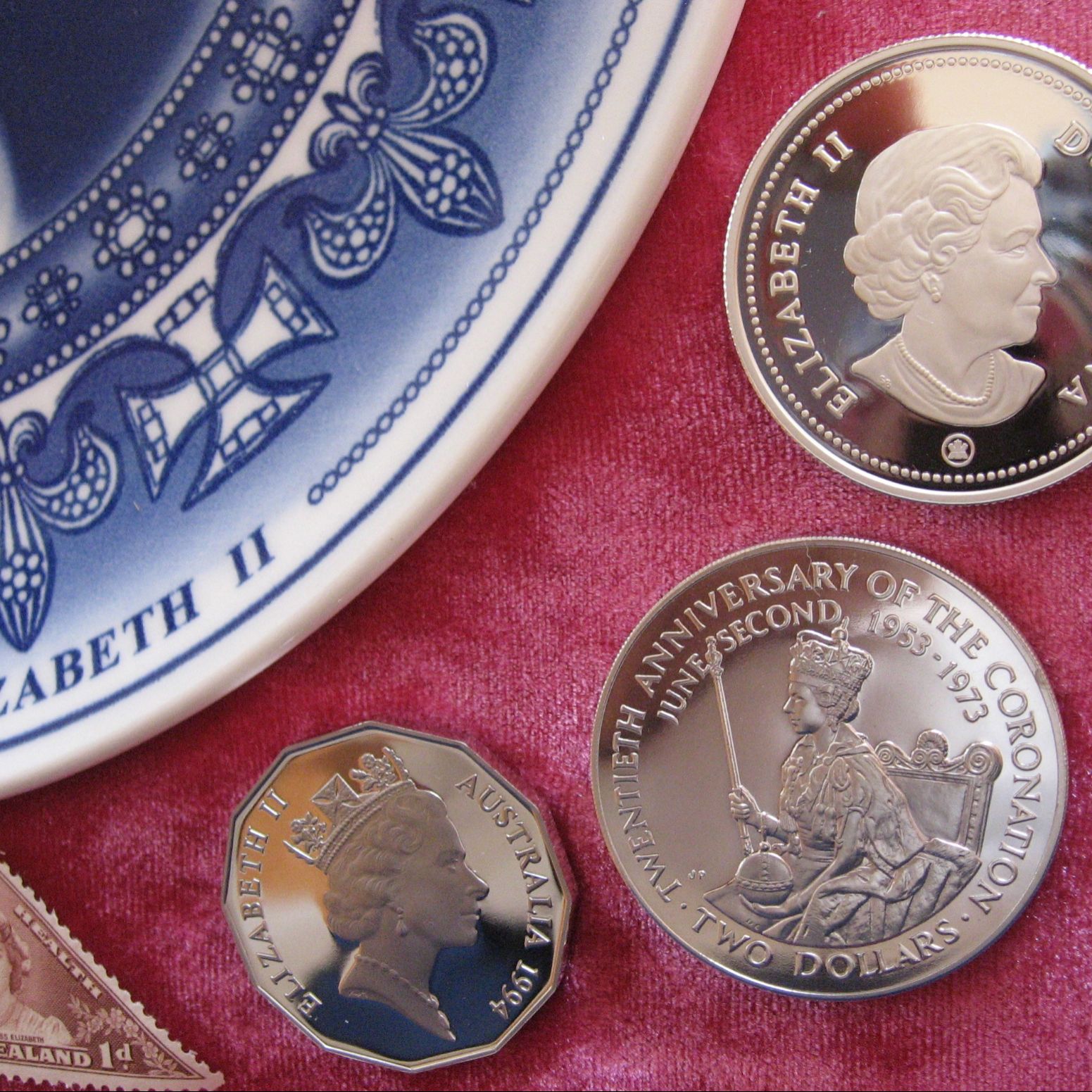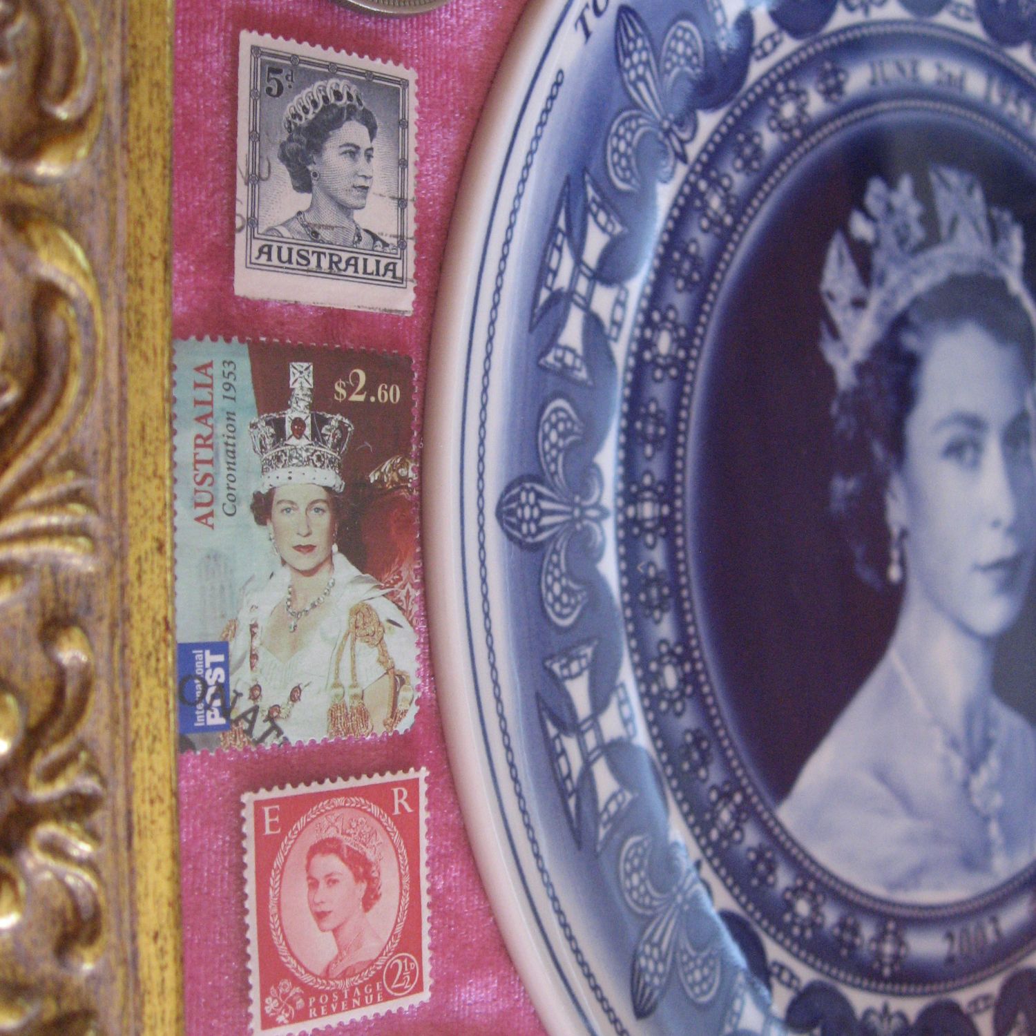 女王エリザベス二世の絵皿とコインを額装しました。初めは絵皿とコインだけでしたが、切手を追加したら更に華やかな楽しいものになりました。
