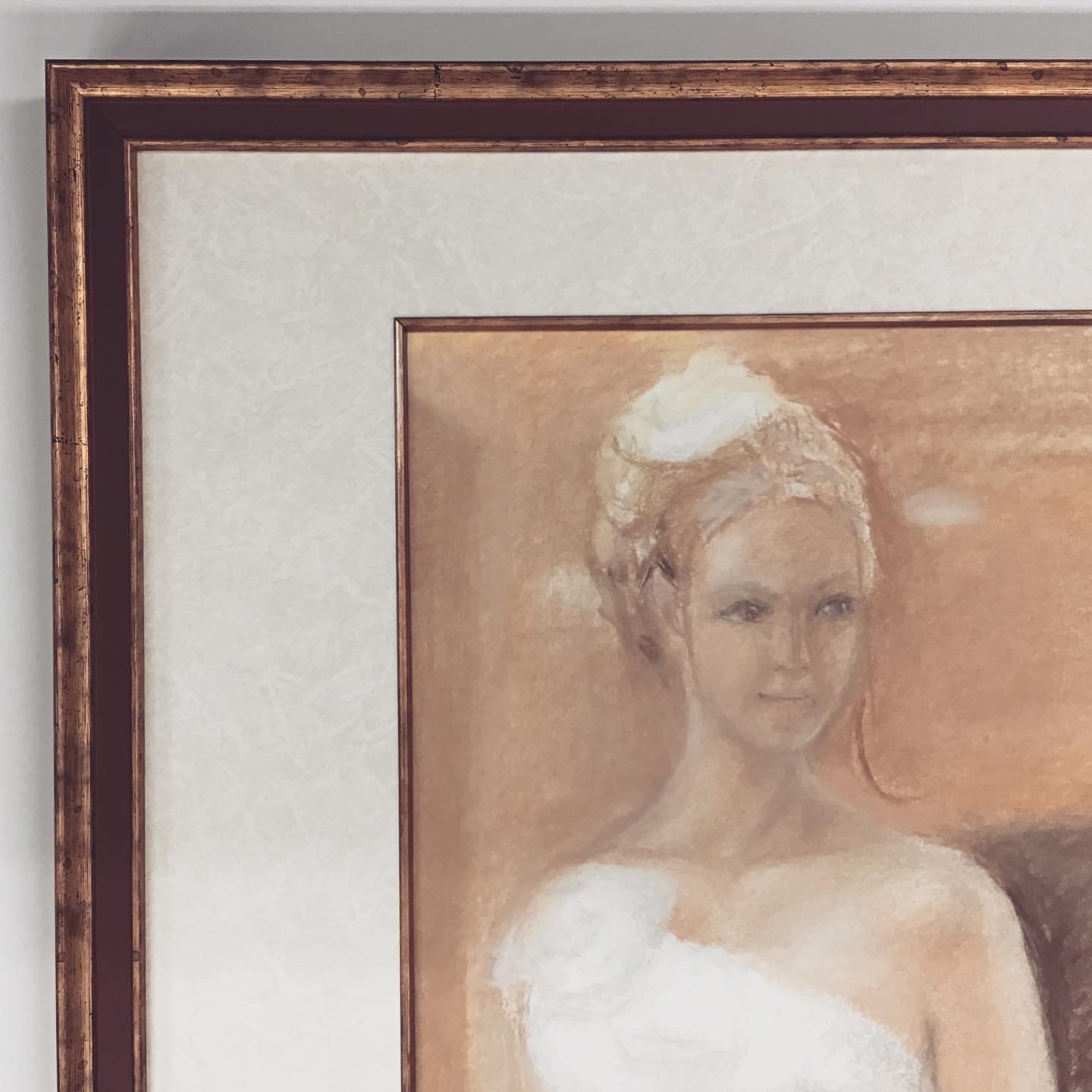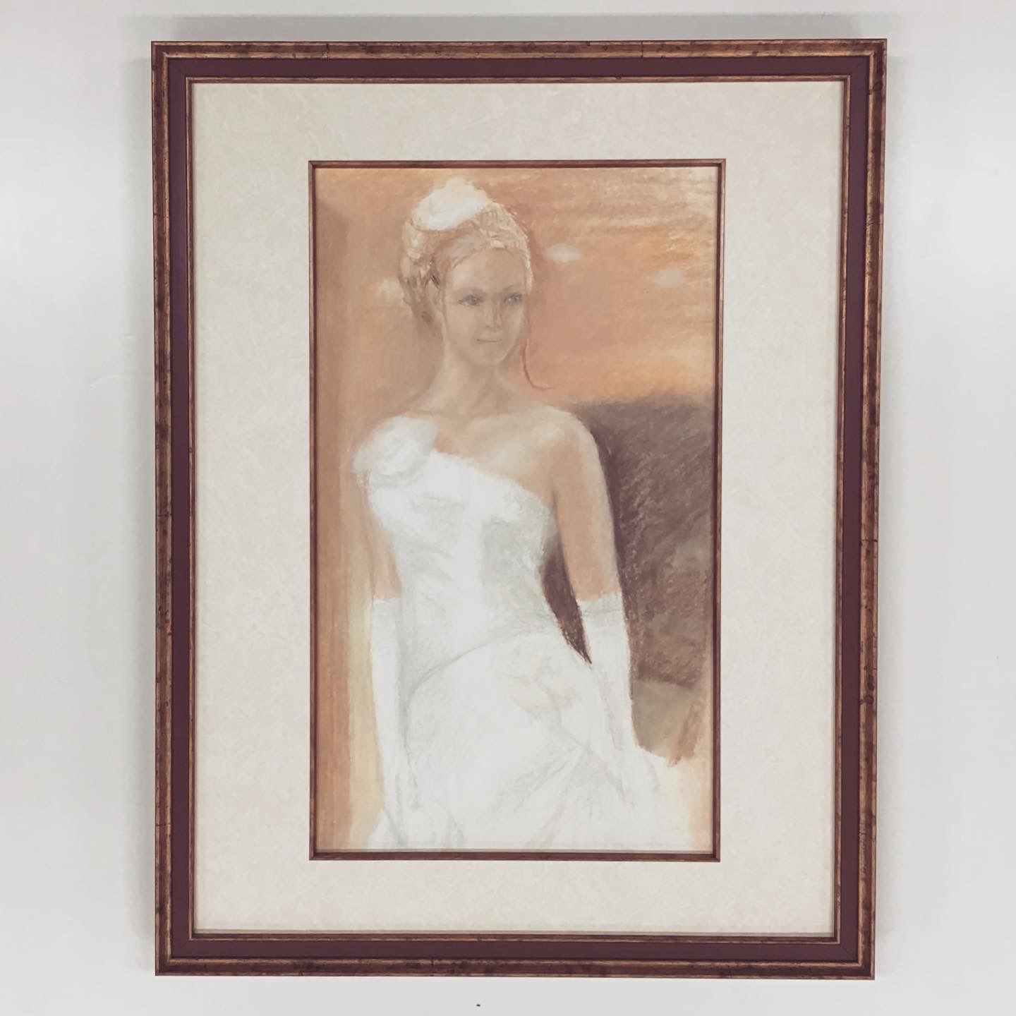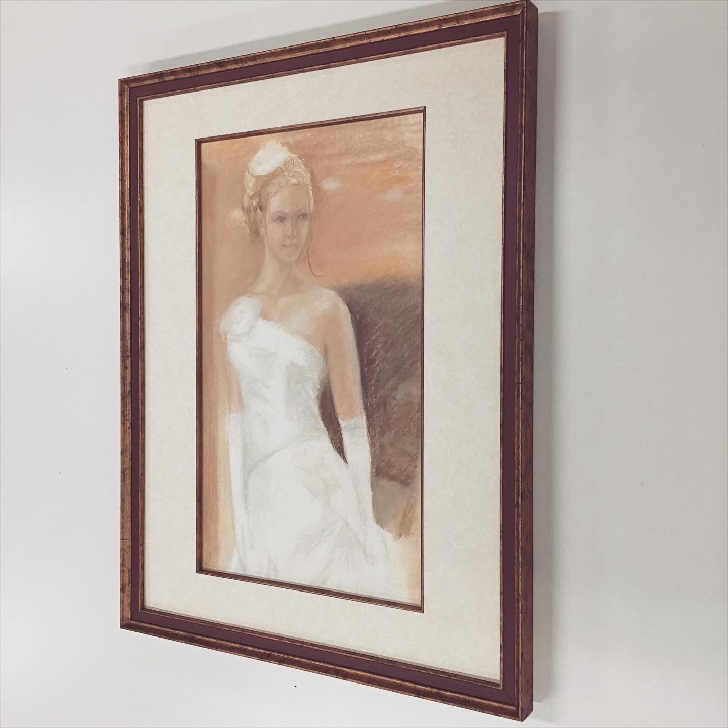 パステル画を額装しました!優しいタッチで描かれた作品です。 こちらの作品は9/22〜9/27までギャラリータカハシ松本にて開催されていた「ジュンジ・オグチ パステル画・水彩スケッチ展」で展示されていました! 女性の華やかさに合わせて、フレームは「5902 Gエンジ 太子サイズ」、マットは少し模様のある白色マットに面金加工(ウッドゴールド)しました!